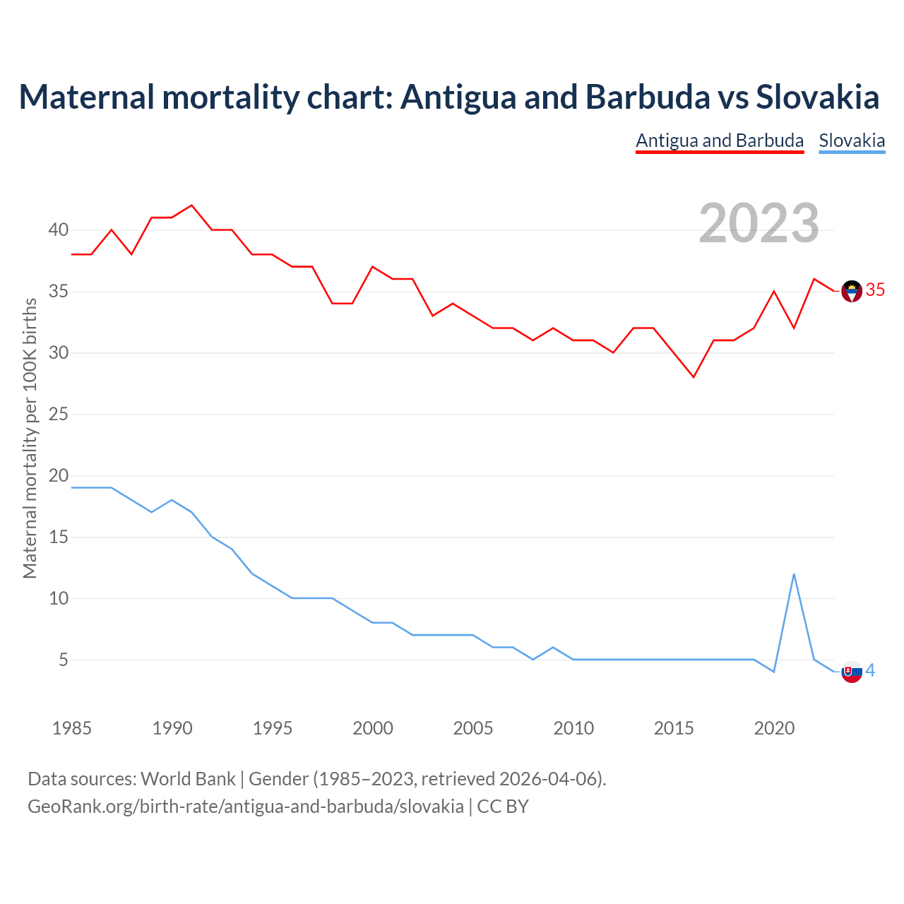 The maternal mortality rate, which is the probability of dying during childbirth or within 42 days of pregnancy termination, is 35 deaths per 100,000 live births in Antigua and Barbuda, compared to 4 deaths in Slovakia.