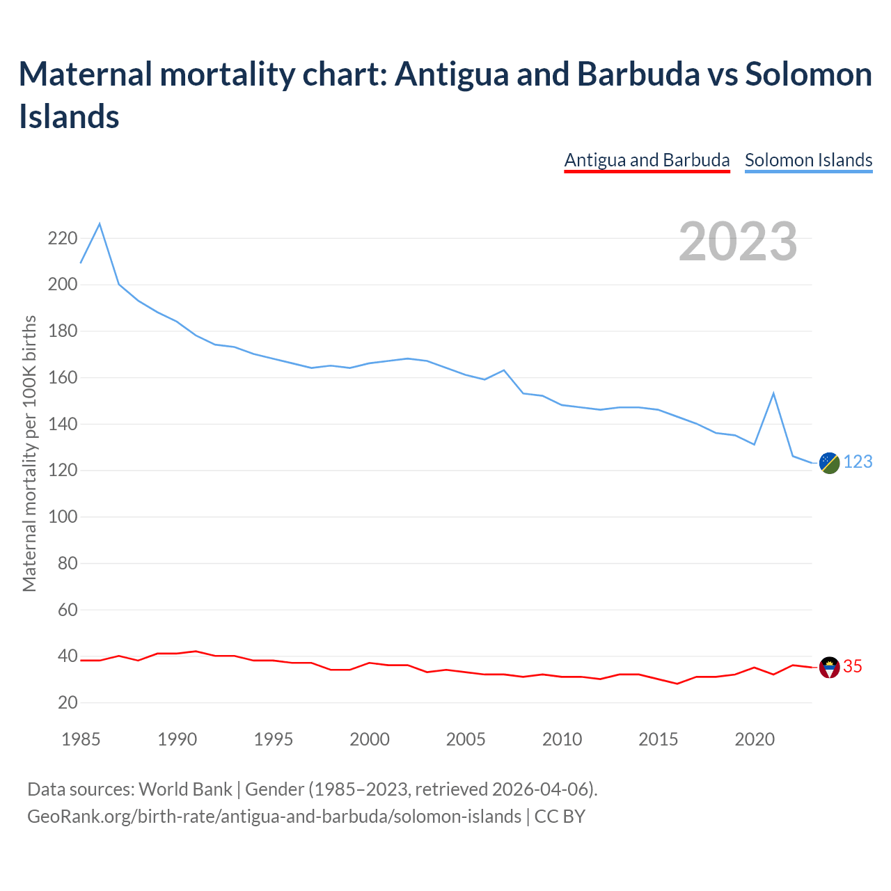 The maternal mortality rate, which is the probability of dying during childbirth or within 42 days of pregnancy termination, is 35 deaths per 100,000 live births in Antigua and Barbuda, compared to 123 deaths in the Solomon Islands.
