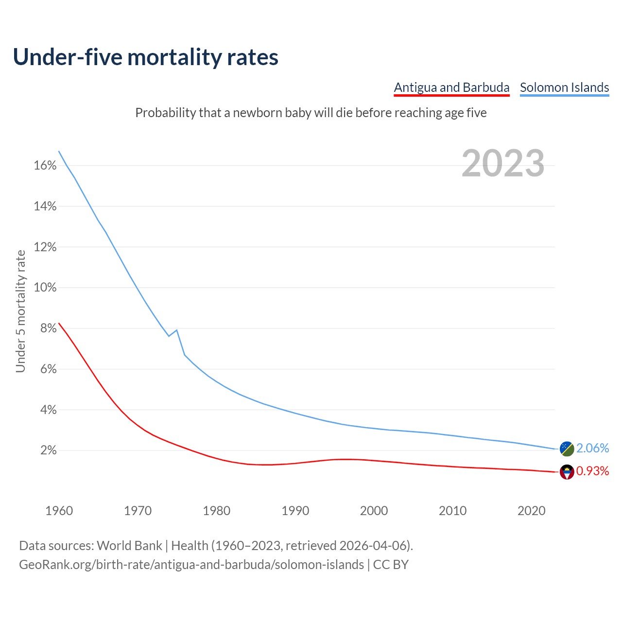 The chance that a newborn baby will die before reaching age five is 0.93% in Antigua and Barbuda and 2.06% in the Solomon Islands. Above is a chart with historical data on under-five mortality rates.