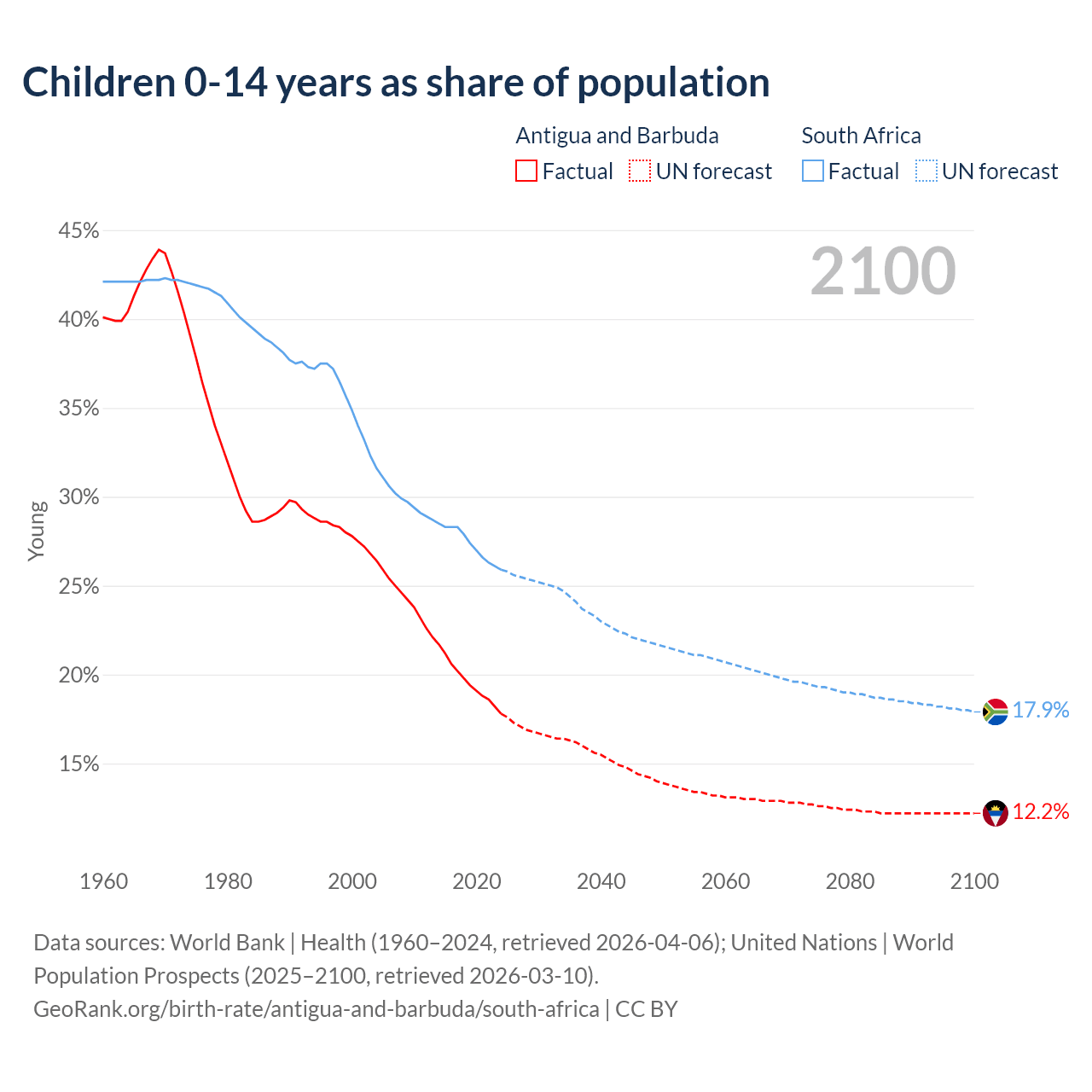 According to the latest available data on birth rates, the fertility rate in Antigua and Barbuda was 1.58 children per woman in 2023, compared to 2.22 in South Africa in 2023. The replacement level is considered to be 2.1 children per woman.