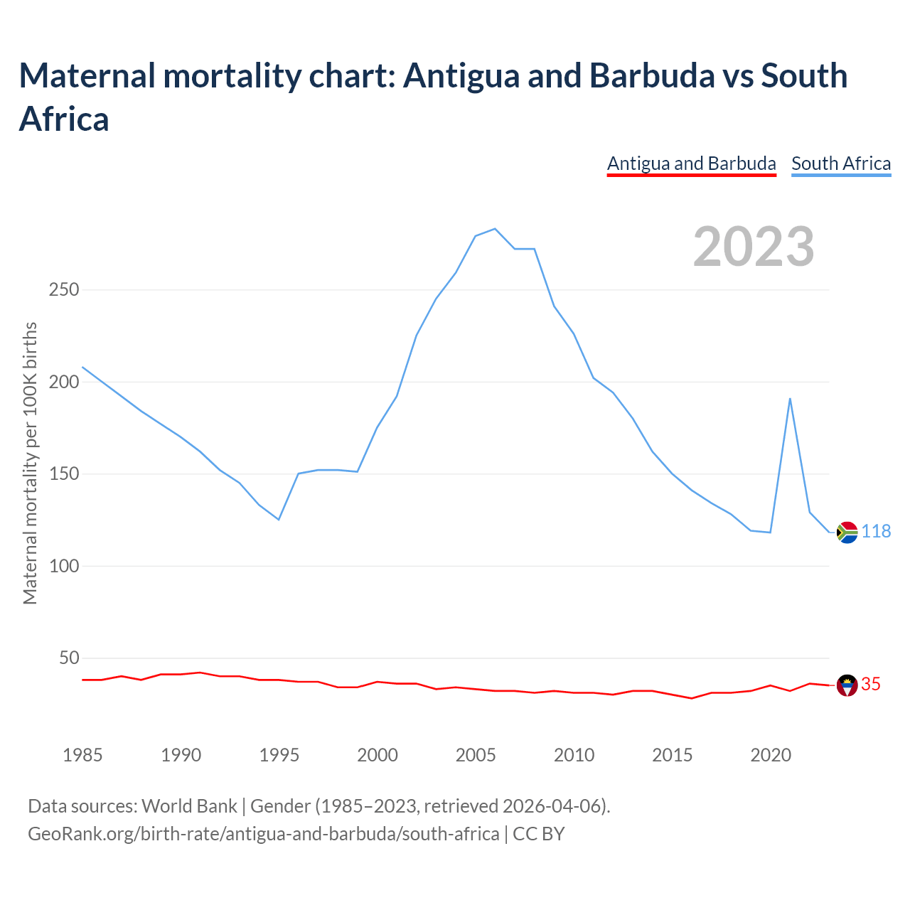 The maternal mortality rate, which is the probability of dying during childbirth or within 42 days of pregnancy termination, is 35 deaths per 100,000 live births in Antigua and Barbuda, compared to 118 deaths in South Africa.
