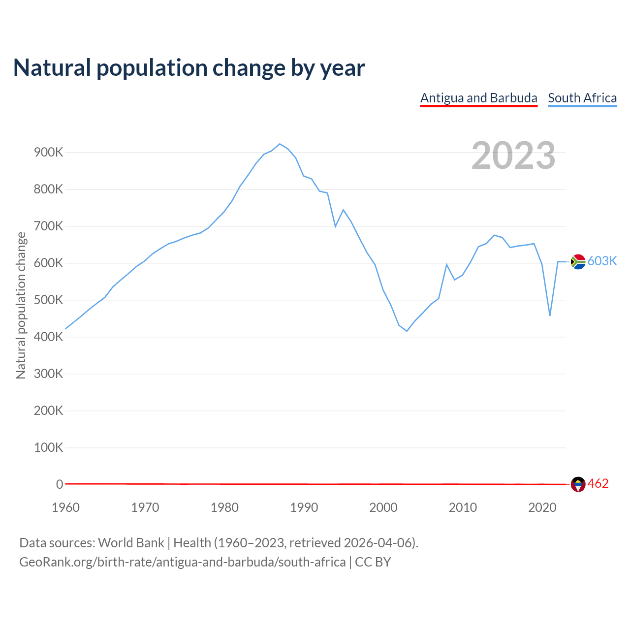 - Antigua and Barbuda is ranked 117/196 by birth rate compared to 82/196 for South Africa.