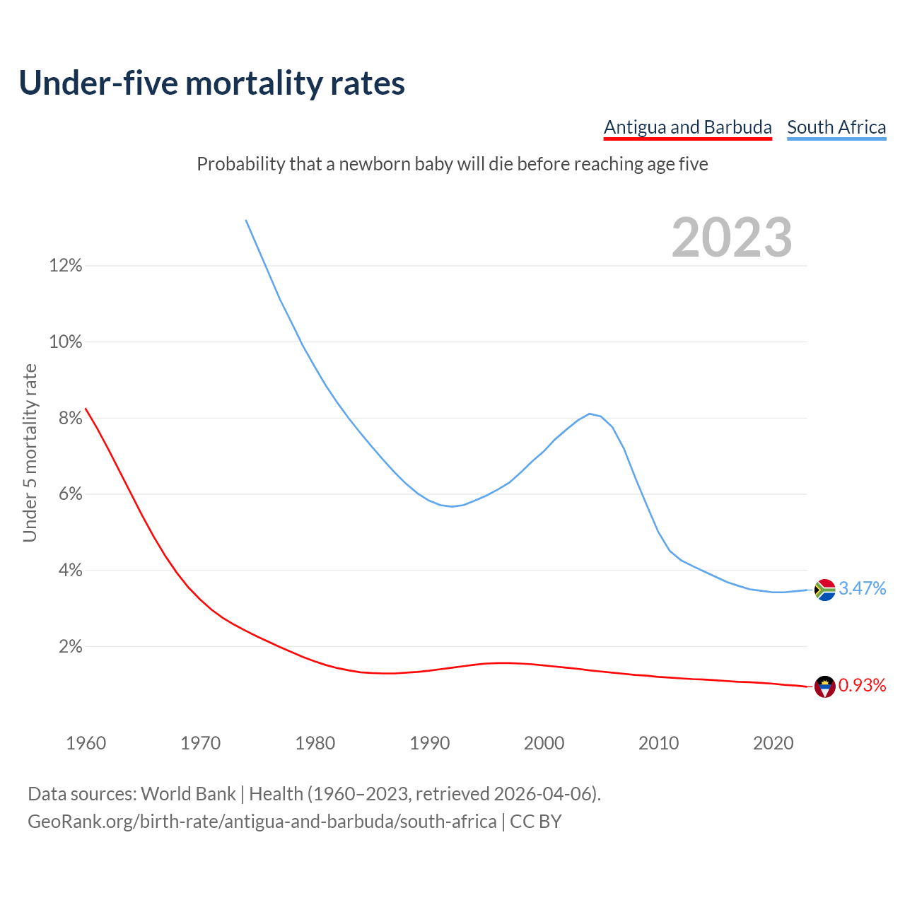 The chance that a newborn baby will die before reaching age five is 0.93% in Antigua and Barbuda and 3.47% in South Africa. Above is a chart with historical data on under-five mortality rates.