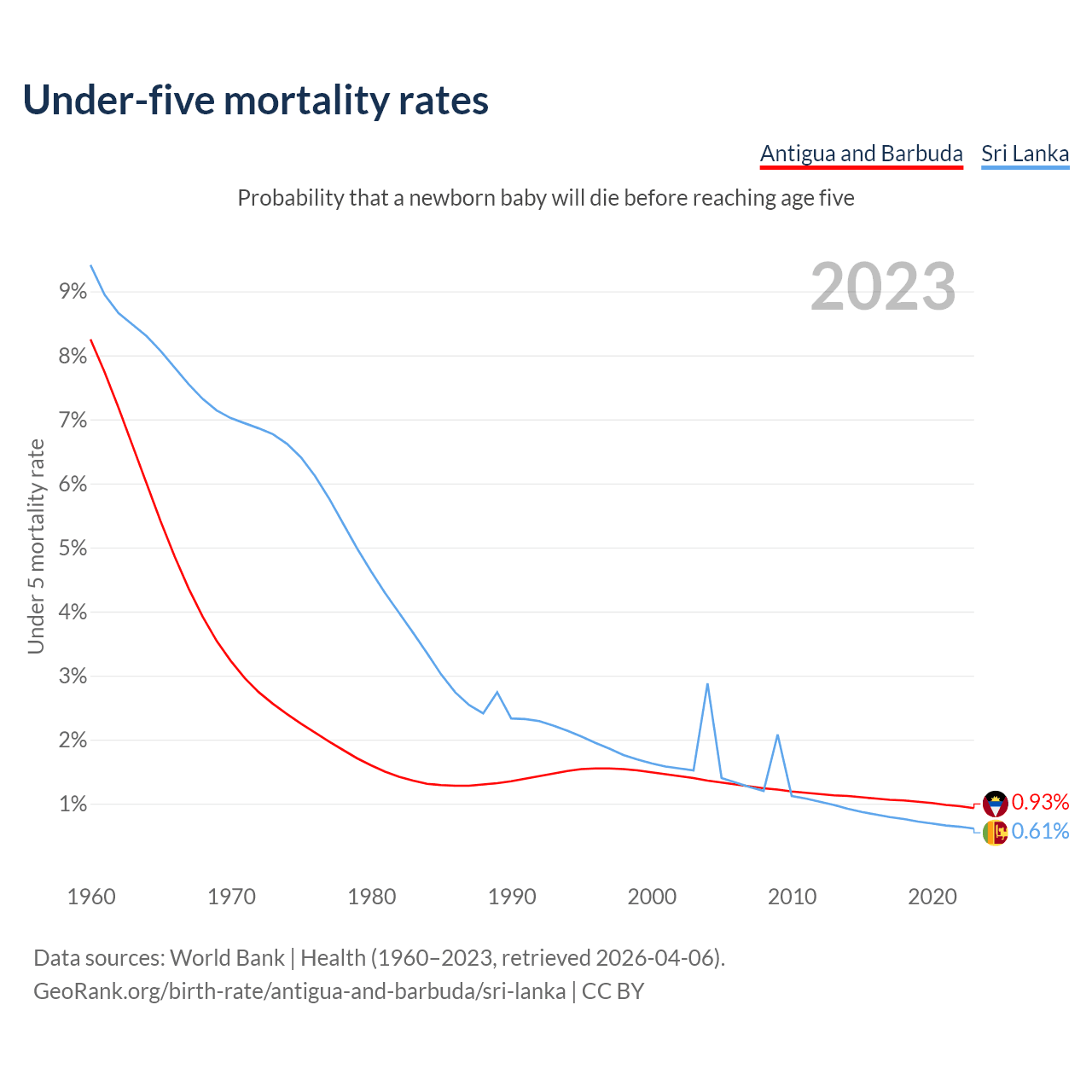 The chance that a newborn baby will die before reaching age five is 0.93% in Antigua and Barbuda and 0.61% in Sri Lanka. Above is a chart with historical data on under-five mortality rates.