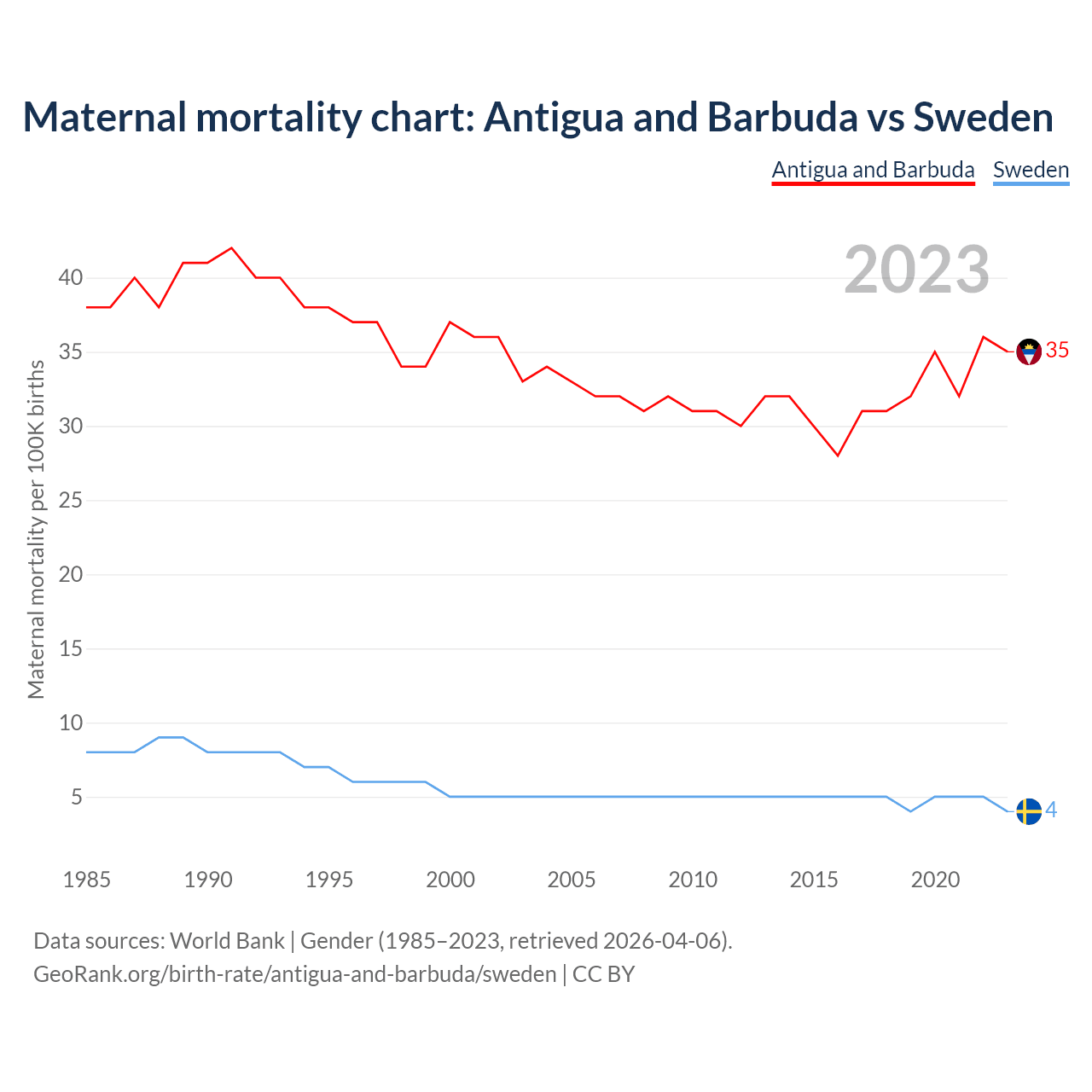 The maternal mortality rate, which is the probability of dying during childbirth or within 42 days of pregnancy termination, is 35 deaths per 100,000 live births in Antigua and Barbuda, compared to 4 deaths in Sweden.