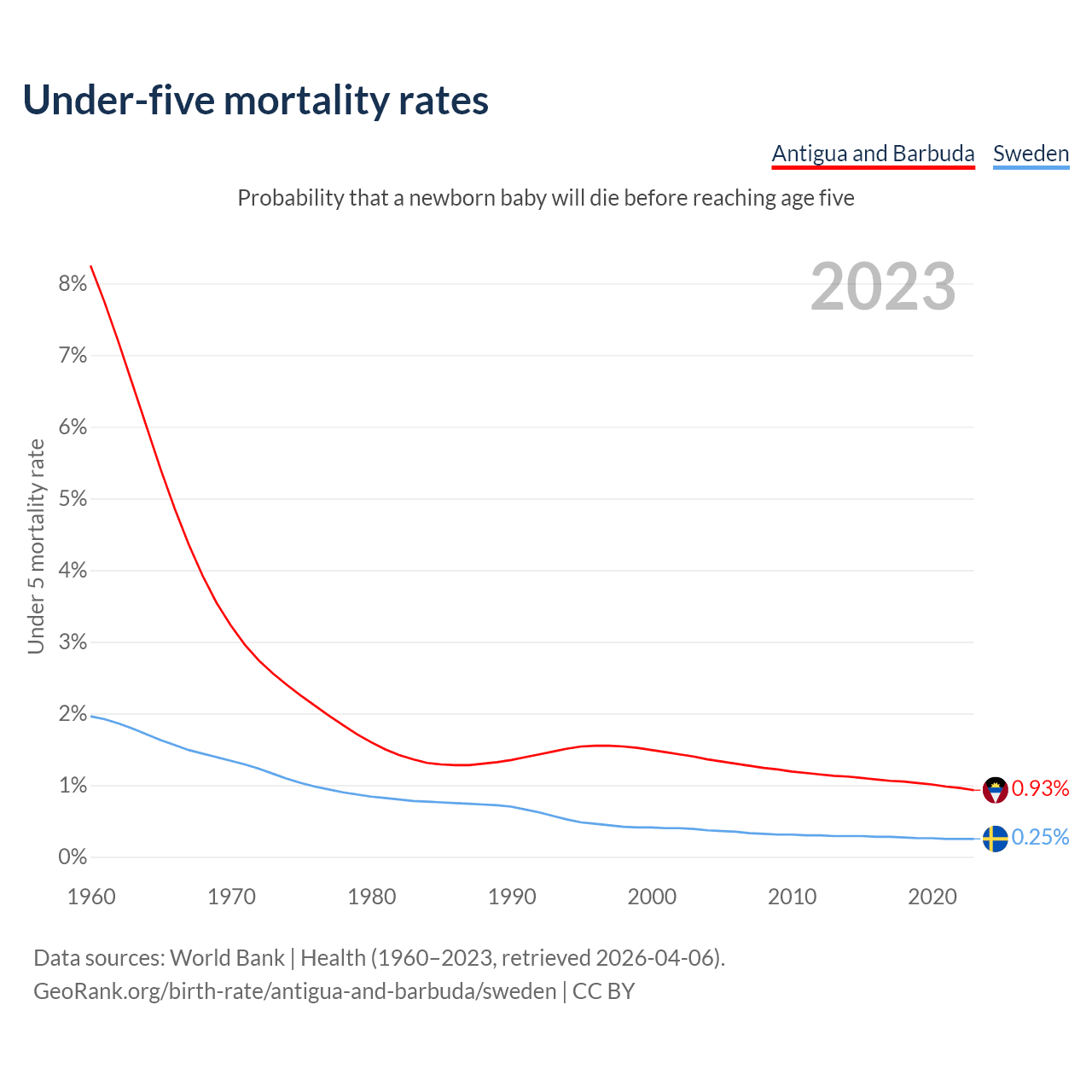 The chance that a newborn baby will die before reaching age five is 0.93% in Antigua and Barbuda and 0.25% in Sweden. Above is a chart with historical data on under-five mortality rates.