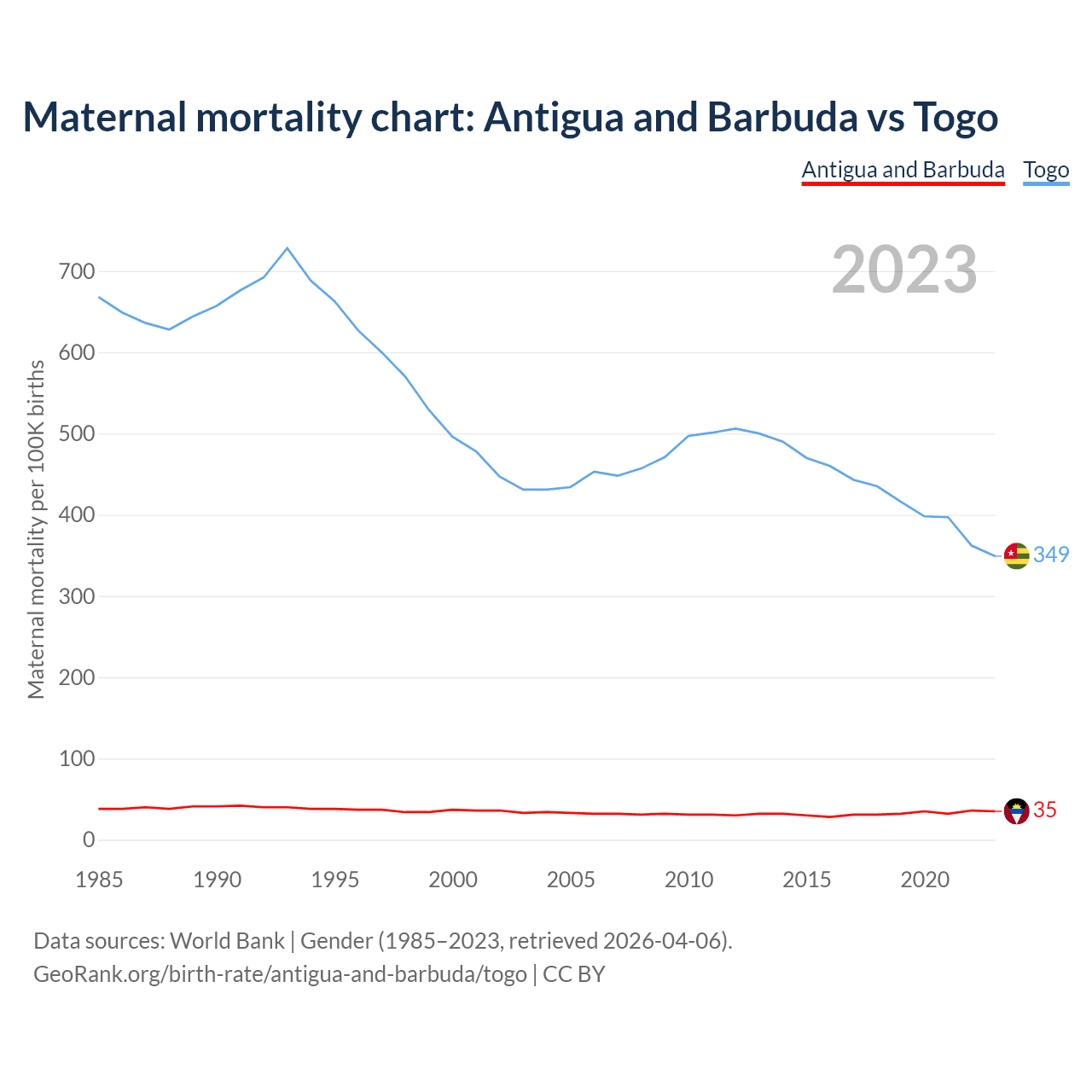 The maternal mortality rate, which is the probability of dying during childbirth or within 42 days of pregnancy termination, is 35 deaths per 100,000 live births in Antigua and Barbuda, compared to 349 deaths in Togo.