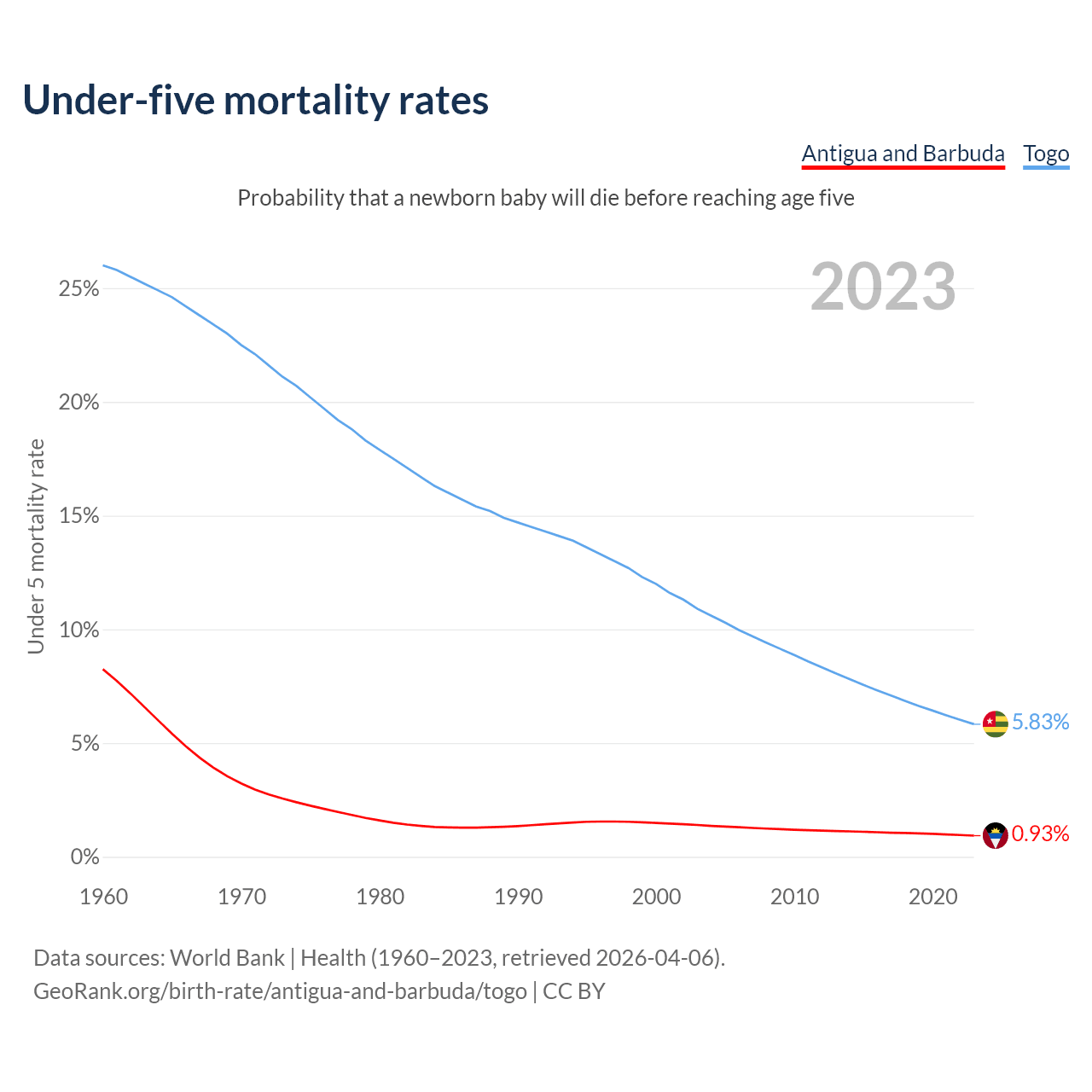 The chance that a newborn baby will die before reaching age five is 0.93% in Antigua and Barbuda and 5.83% in Togo. Above is a chart with historical data on under-five mortality rates.