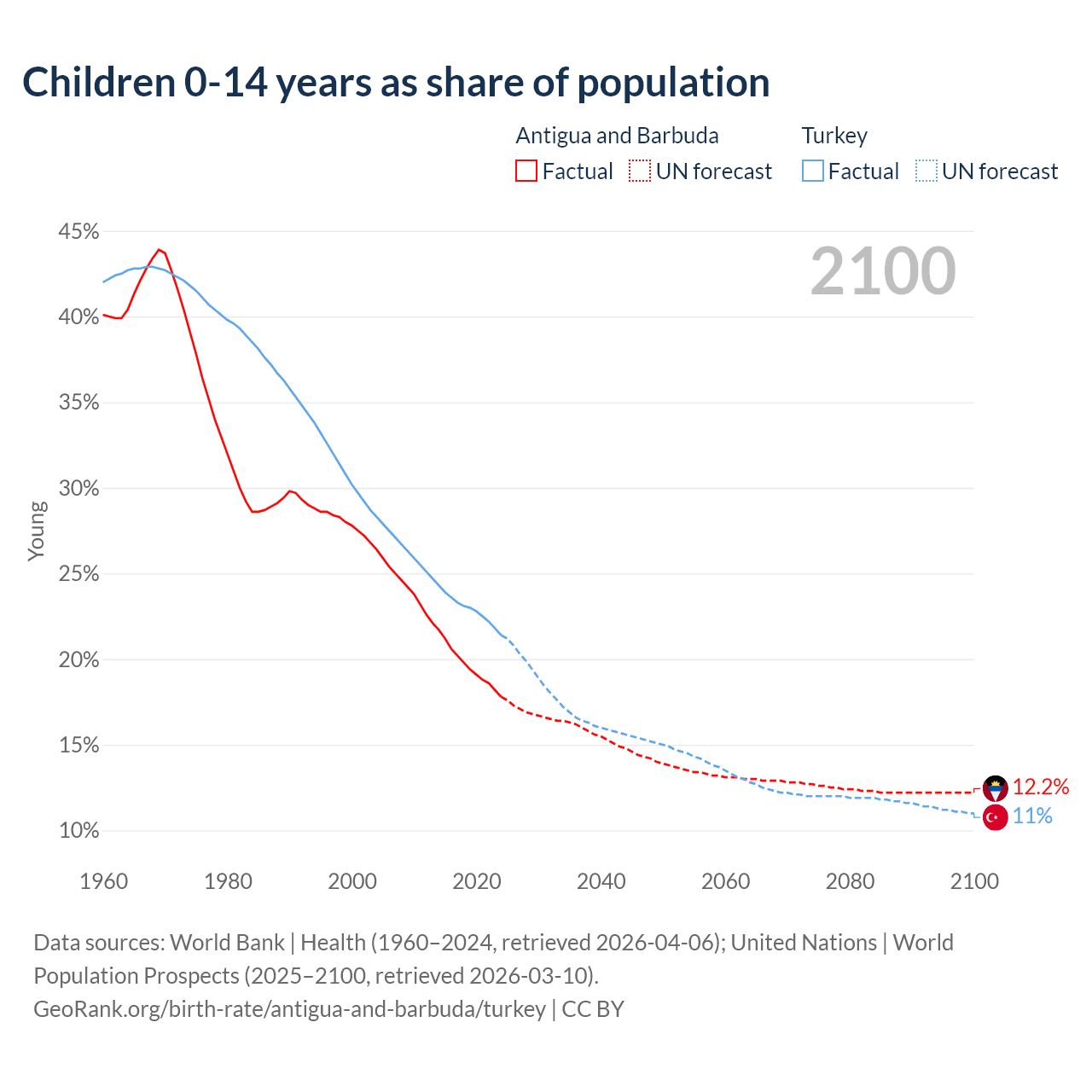 According to the latest available data on birth rates, the fertility rate in Antigua and Barbuda was 1.58 children per woman in 2023, compared to 1.51 in Turkey in 2023. The replacement level is considered to be 2.1 children per woman.