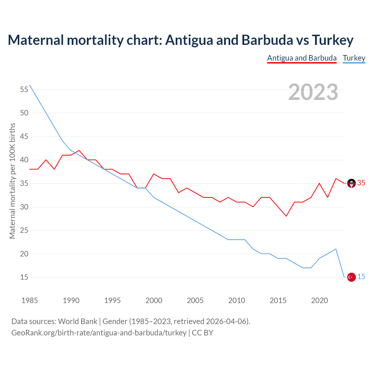 The maternal mortality rate, which is the probability of dying during childbirth or within 42 days of pregnancy termination, is 35 deaths per 100,000 live births in Antigua and Barbuda, compared to 15 deaths in Turkey.