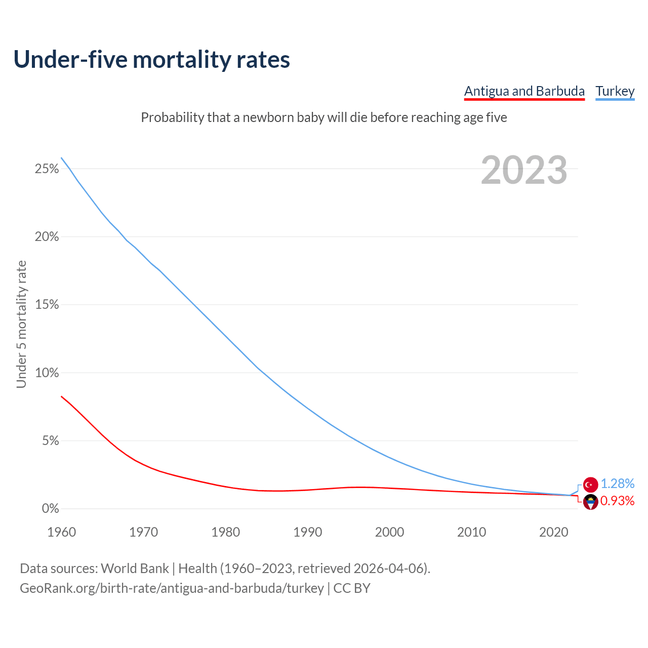The chance that a newborn baby will die before reaching age five is 0.93% in Antigua and Barbuda and 1.28% in Turkey. Above is a chart with historical data on under-five mortality rates.