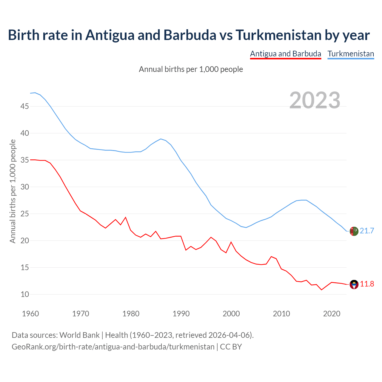 Antigua and Barbuda has an annual birth rate of 11.8 births per 1,000 people, compared to 21.7 for Turkmenistan. The average number of children a woman is expected to have during her lifetime — the fertility rate, is 1.58 in Antigua and Barbuda and 2.69 in Turkmenistan — 70.5% difference.