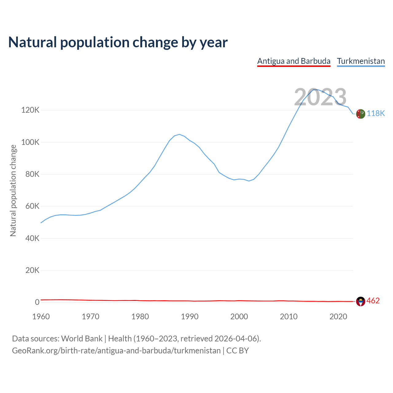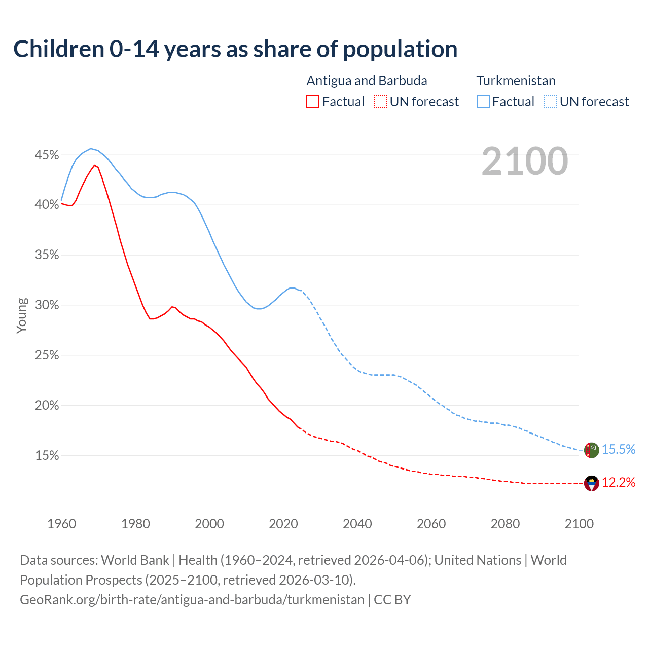 According to the latest available data on birth rates, the fertility rate in Antigua and Barbuda was 1.58 children per woman in 2023, compared to 2.69 in Turkmenistan in 2023. The replacement level is considered to be 2.1 children per woman.
