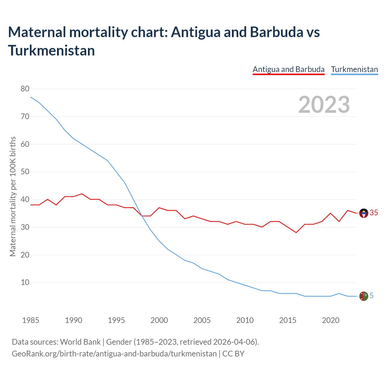 The maternal mortality rate, which is the probability of dying during childbirth or within 42 days of pregnancy termination, is 35 deaths per 100,000 live births in Antigua and Barbuda, compared to 5 deaths in Turkmenistan.