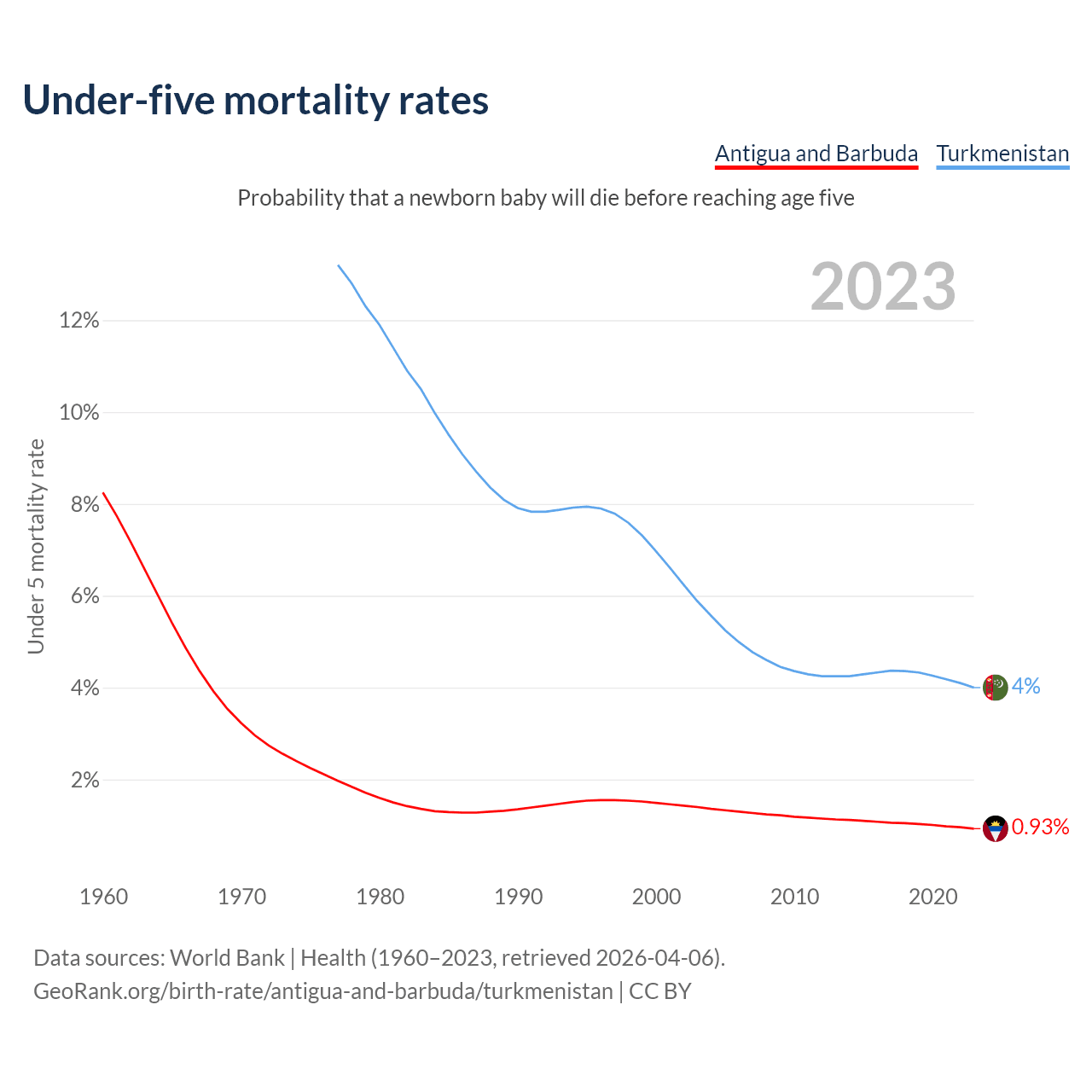 The chance that a newborn baby will die before reaching age five is 0.93% in Antigua and Barbuda and 4% in Turkmenistan. Above is a chart with historical data on under-five mortality rates.