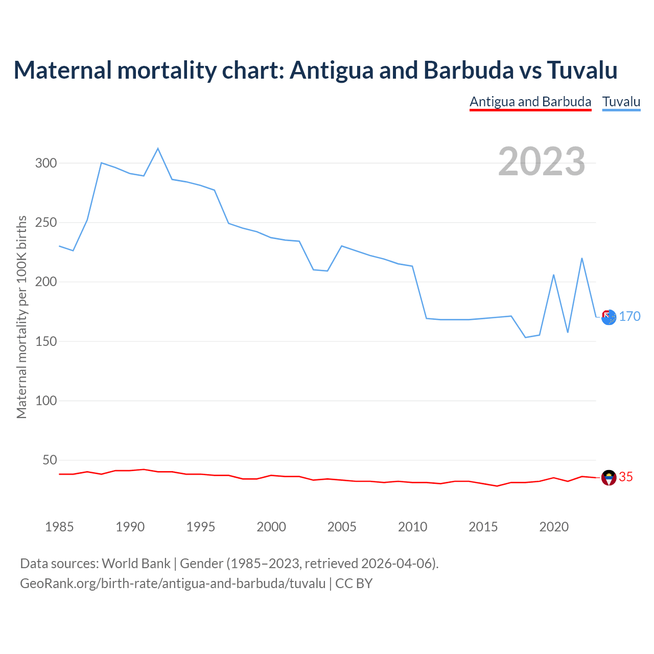 The maternal mortality rate, which is the probability of dying during childbirth or within 42 days of pregnancy termination, is 35 deaths per 100,000 live births in Antigua and Barbuda, compared to 170 deaths in Tuvalu.