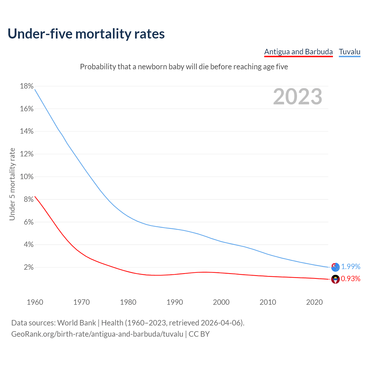 The chance that a newborn baby will die before reaching age five is 0.93% in Antigua and Barbuda and 1.99% in Tuvalu. Above is a chart with historical data on under-five mortality rates.