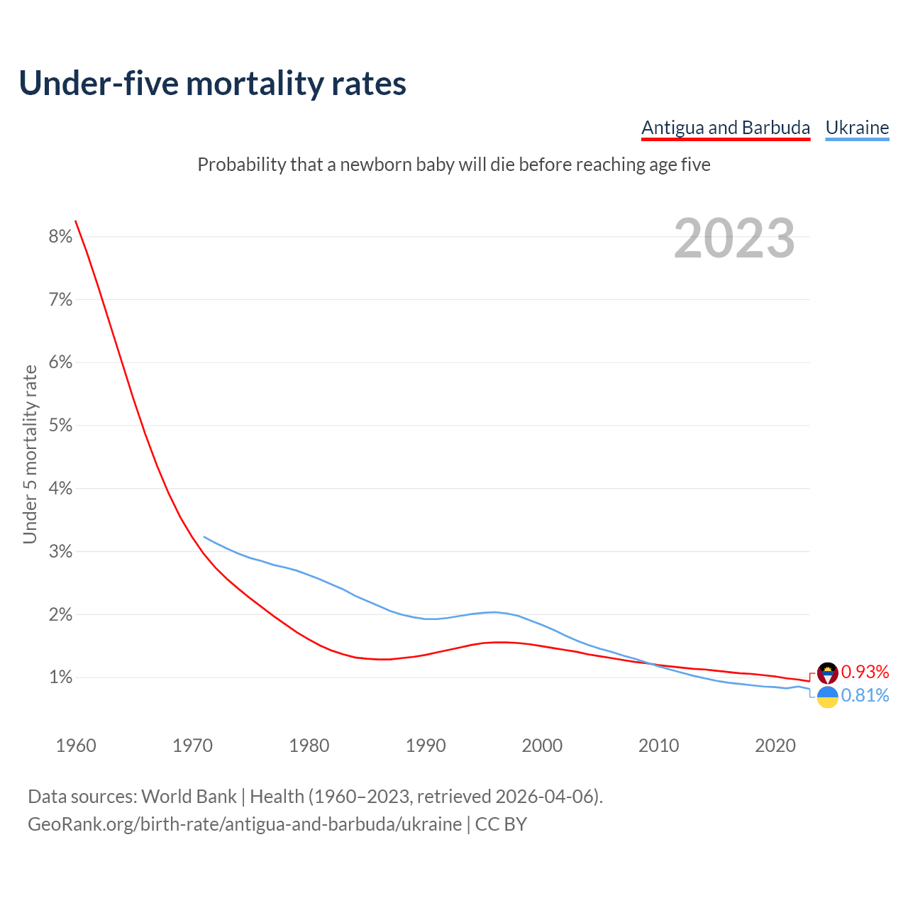 The chance that a newborn baby will die before reaching age five is 0.93% in Antigua and Barbuda and 0.81% in Ukraine. Above is a chart with historical data on under-five mortality rates.