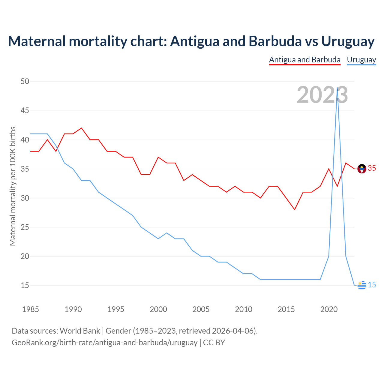 The maternal mortality rate, which is the probability of dying during childbirth or within 42 days of pregnancy termination, is 35 deaths per 100,000 live births in Antigua and Barbuda, compared to 15 deaths in Uruguay.