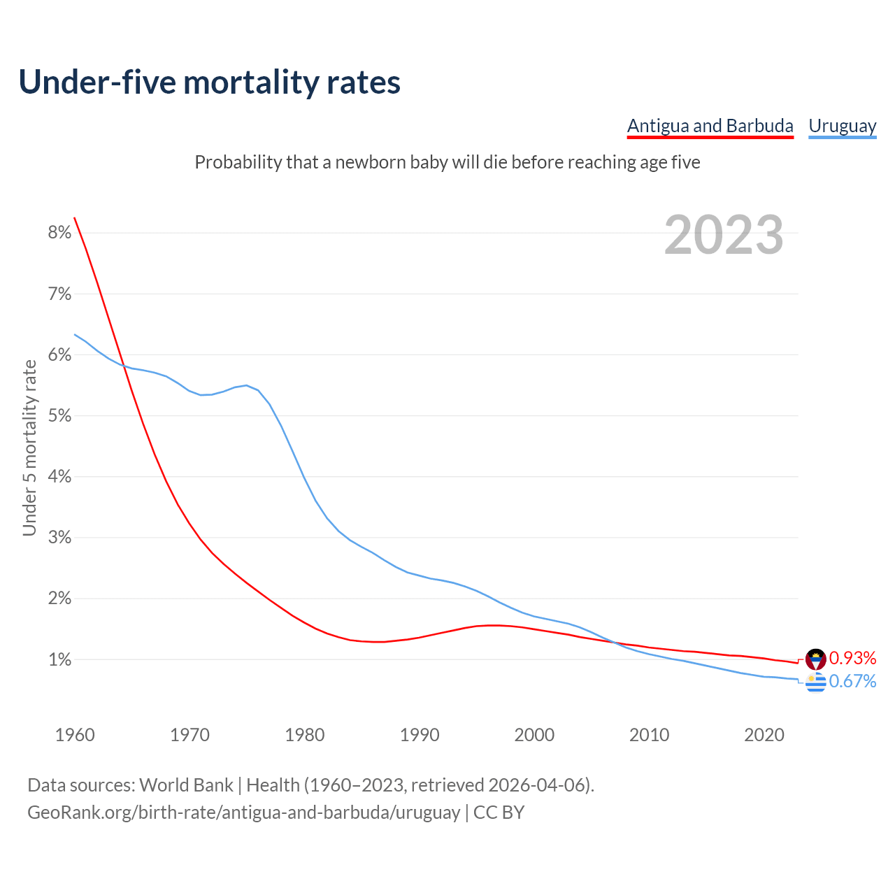 The chance that a newborn baby will die before reaching age five is 0.93% in Antigua and Barbuda and 0.67% in Uruguay. Above is a chart with historical data on under-five mortality rates.