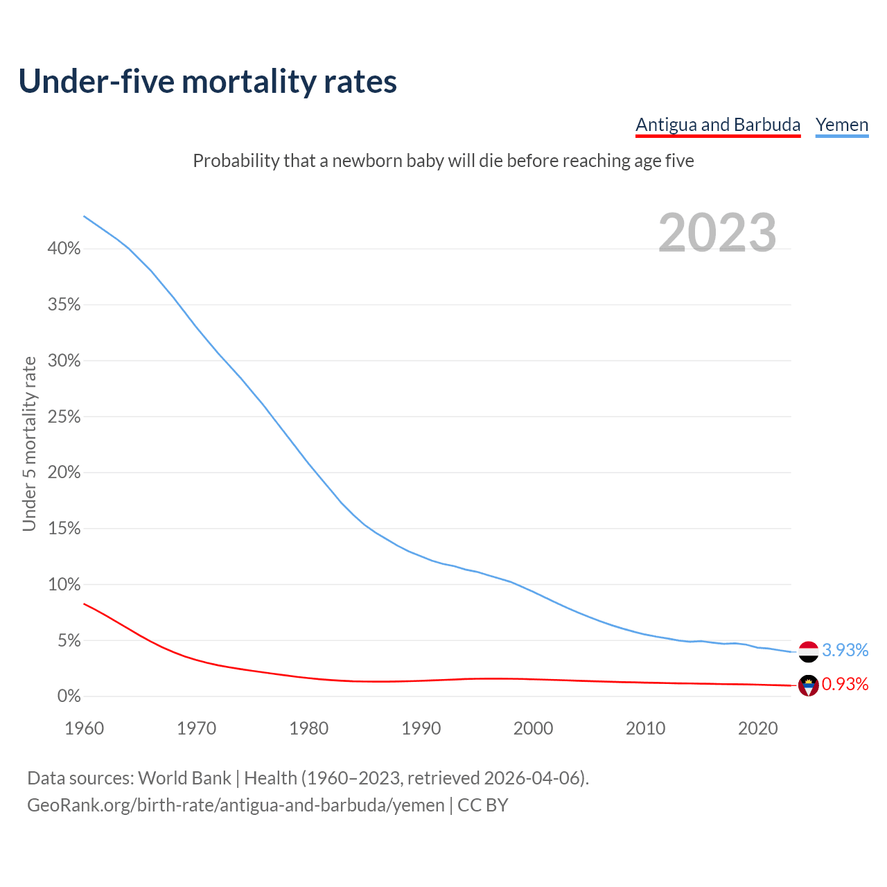 The chance that a newborn baby will die before reaching age five is 0.93% in Antigua and Barbuda and 3.93% in Yemen. Above is a chart with historical data on under-five mortality rates.