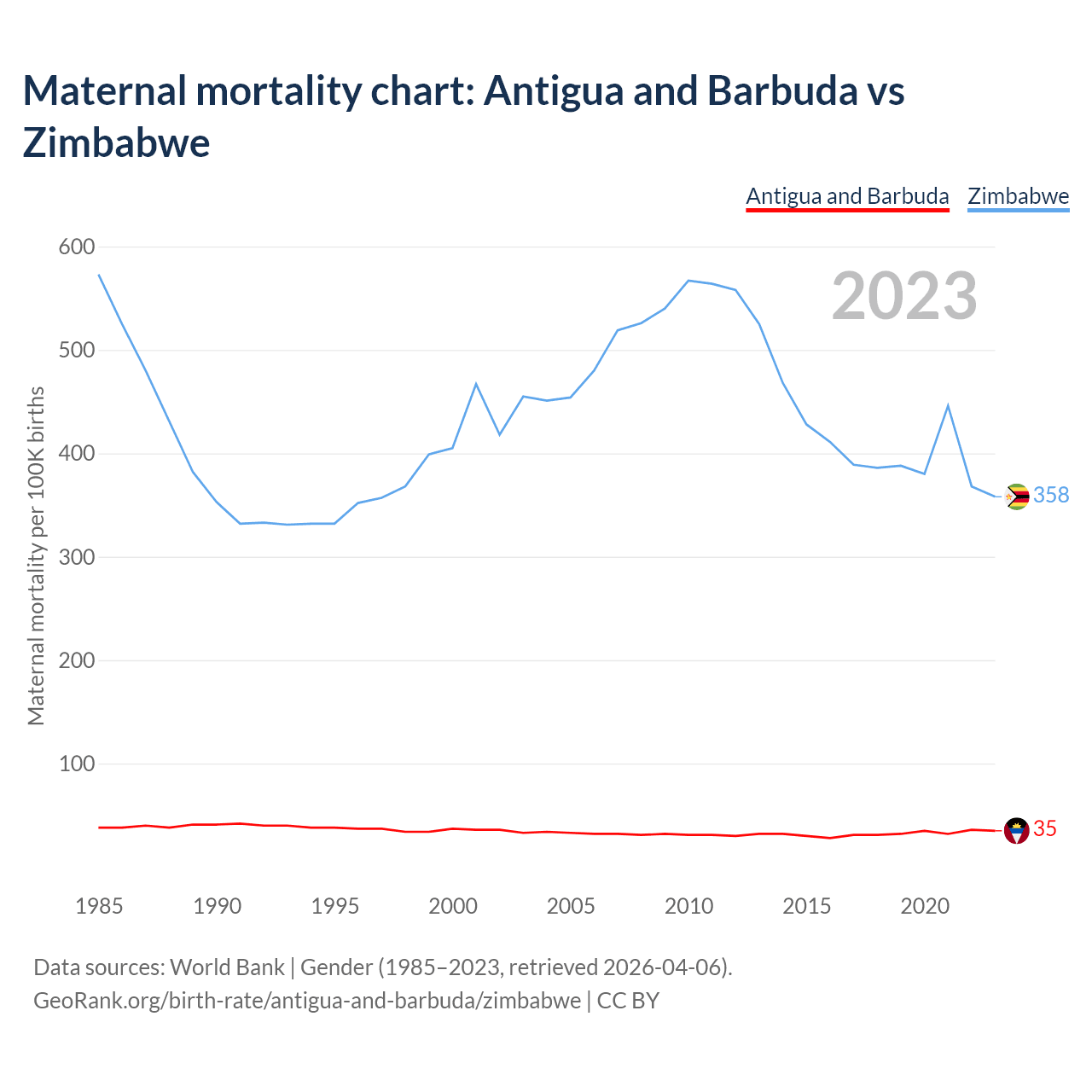 The maternal mortality rate, which is the probability of dying during childbirth or within 42 days of pregnancy termination, is 35 deaths per 100,000 live births in Antigua and Barbuda, compared to 358 deaths in Zimbabwe.