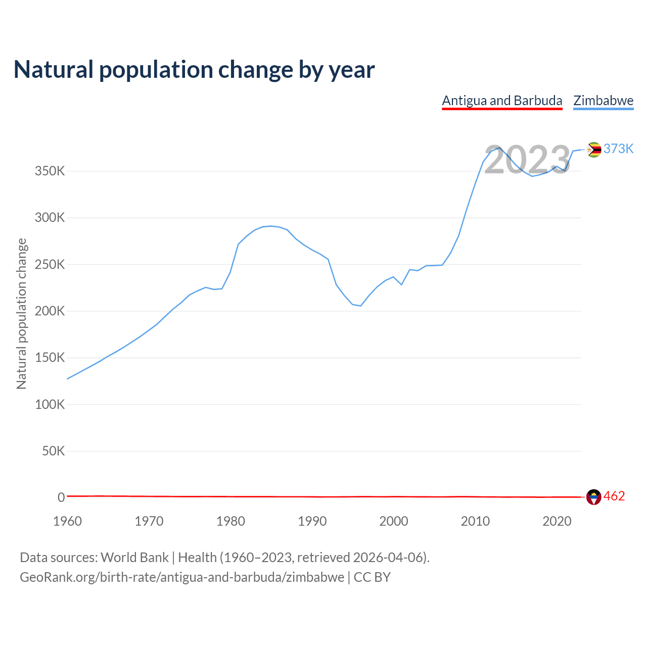 Check Antigua and Barbuda vs Zimbabwe population clock for a dynamic visualization of the changing population.