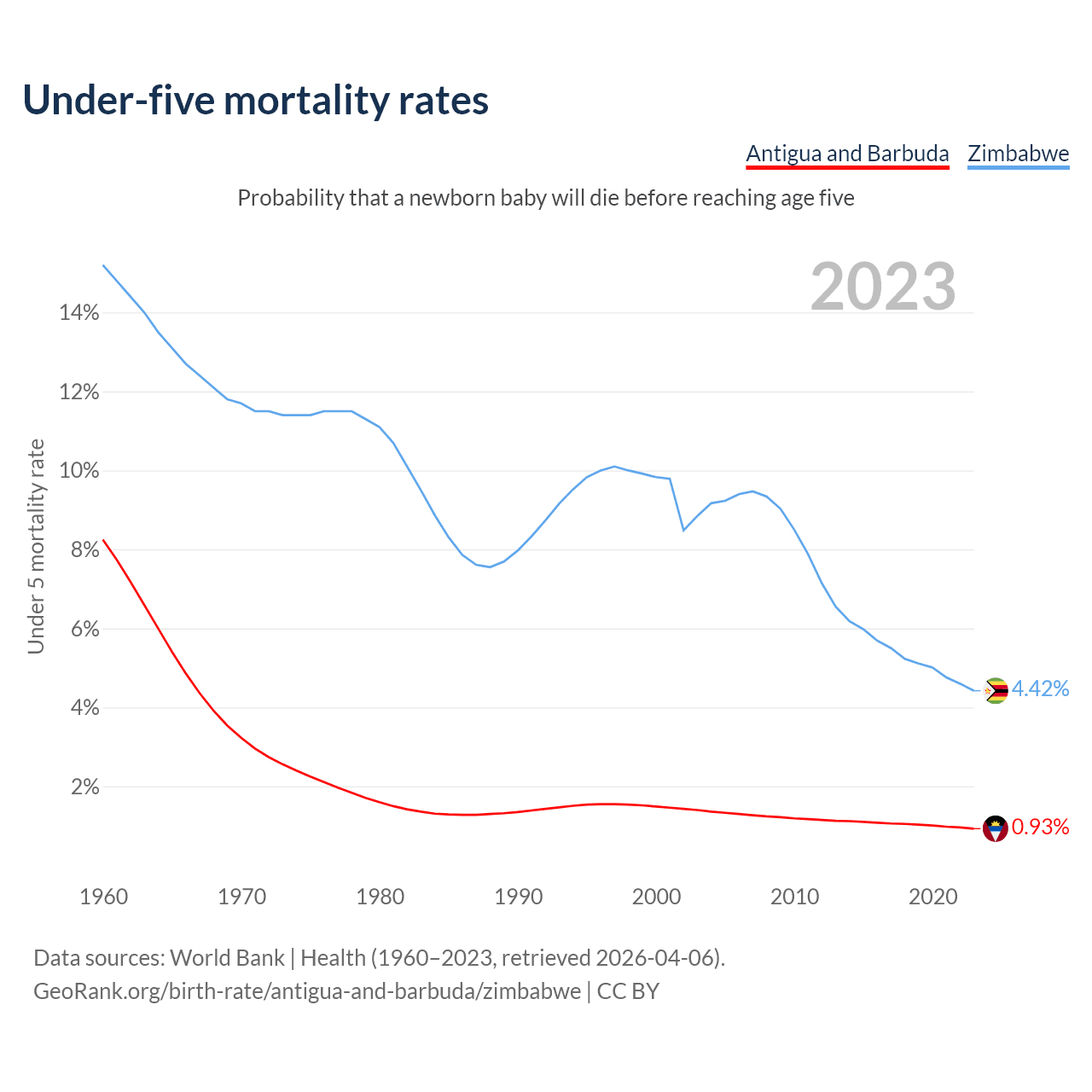 The chance that a newborn baby will die before reaching age five is 0.93% in Antigua and Barbuda and 4.42% in Zimbabwe. Above is a chart with historical data on under-five mortality rates.