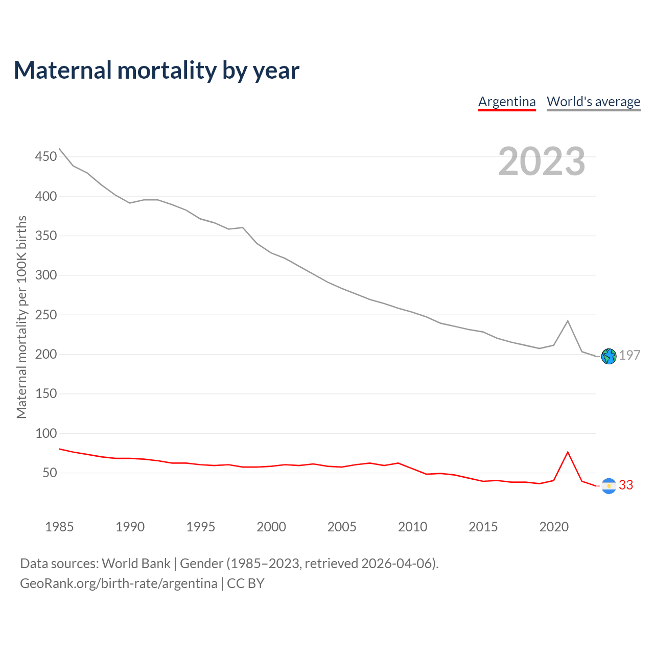 The maternal mortality rate in Argentina was 33 deaths per 100,000 live births in 2023 — a 0.03% chance of dying during childbirth or within 42 days of pregnancy termination. This is a 43.1% decrease compared to the year 2000.