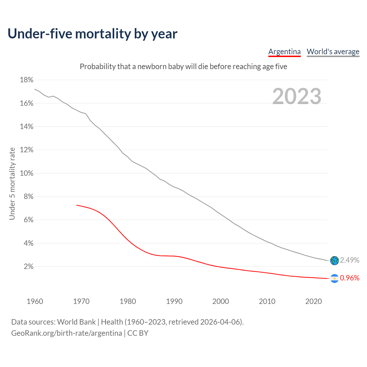 The under-5 mortality rate in Argentina was 9.6 deaths per 1,000 live births in 2023 — a 0.96% chance that a newborn baby will die before reaching age five. This is down from 19.4 deaths per 1,000 live births in 2000.