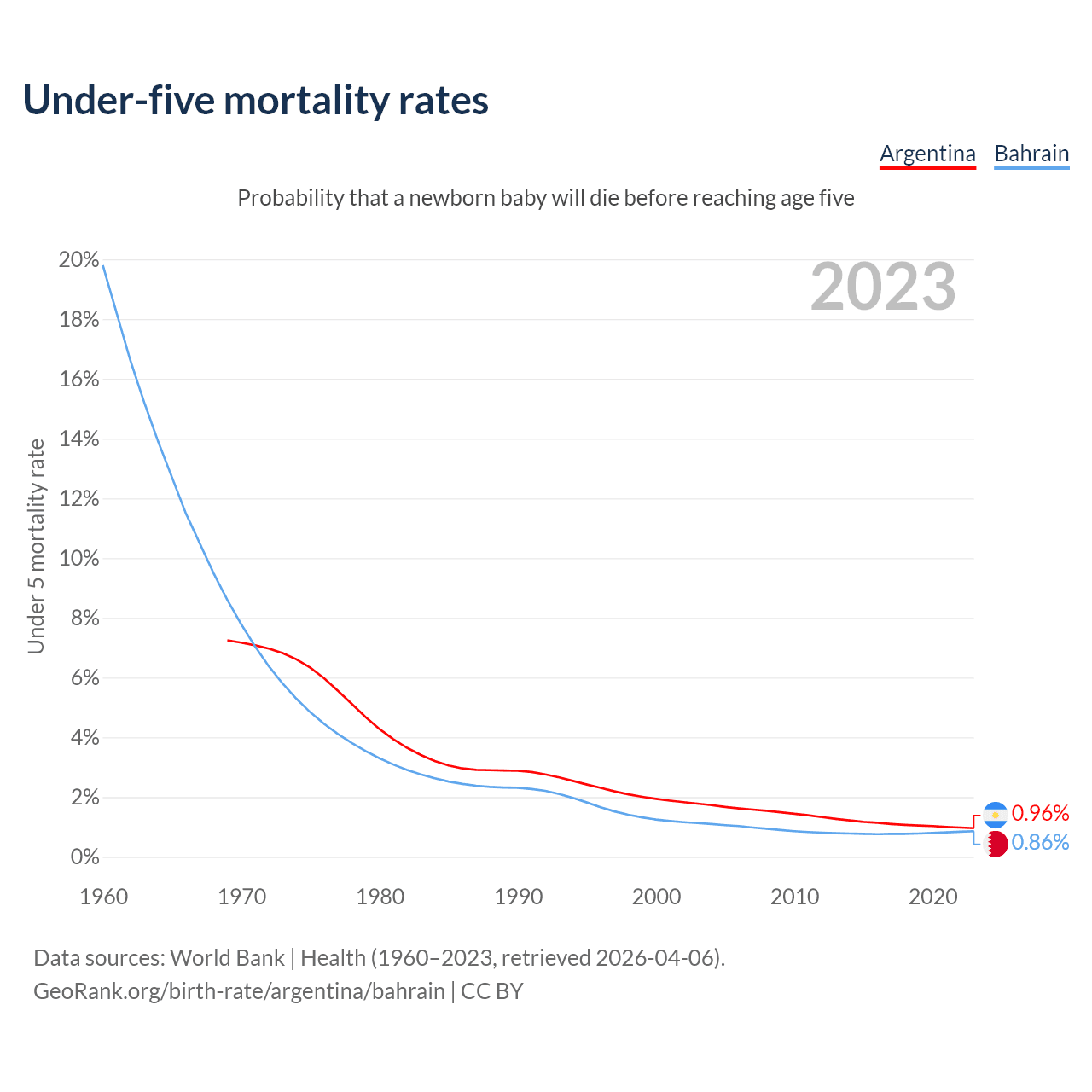 The chance that a newborn baby will die before reaching age five is 0.96% in Argentina and 0.86% in Bahrain. Above is a chart with historical data on under-five mortality rates.