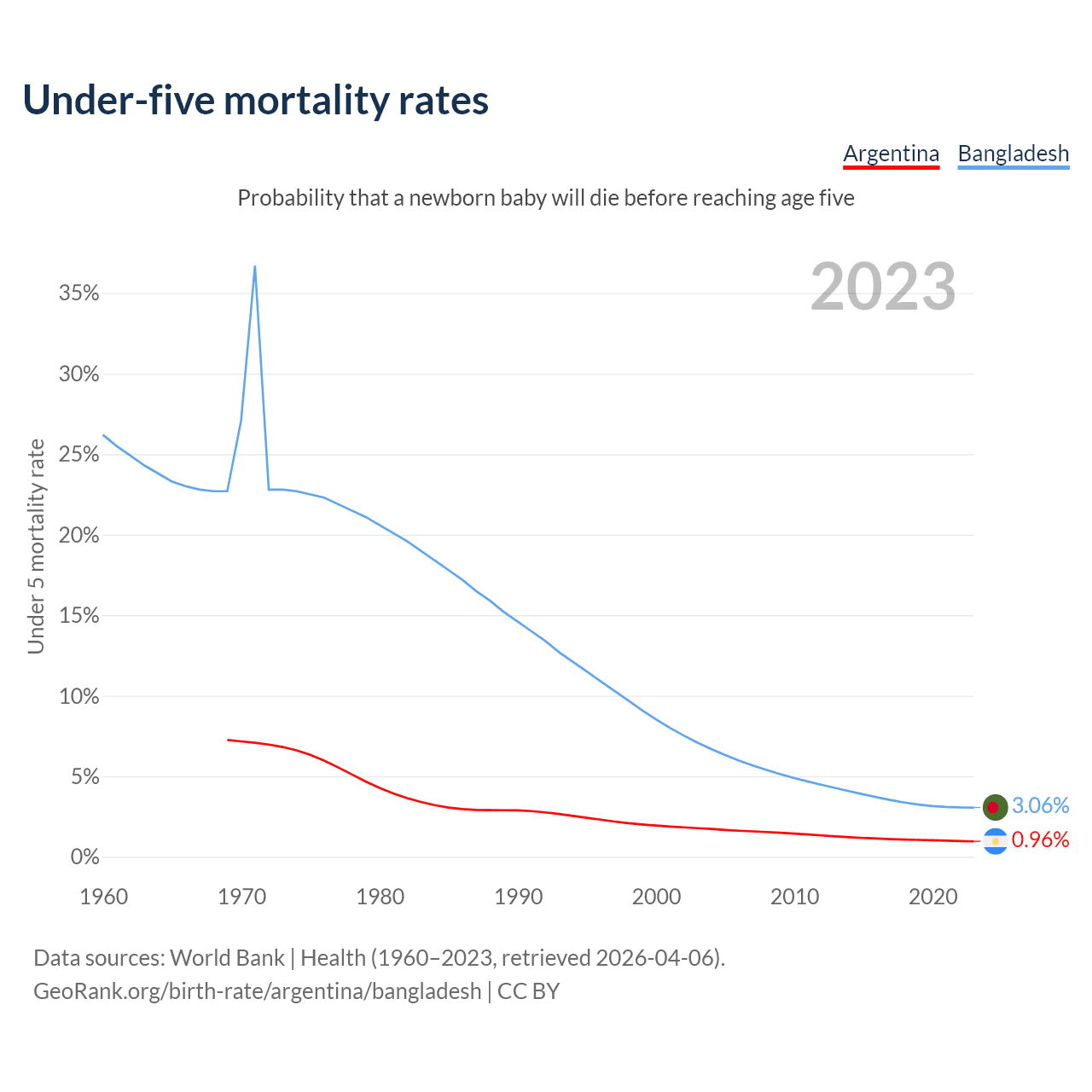 The chance that a newborn baby will die before reaching age five is 0.96% in Argentina and 3.06% in Bangladesh. Above is a chart with historical data on under-five mortality rates.