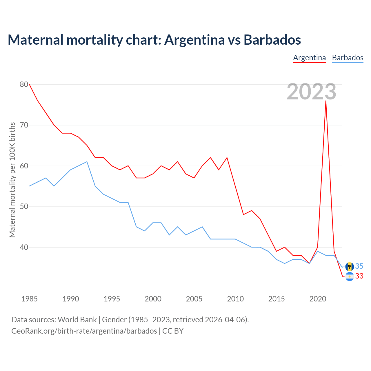 The maternal mortality rate, which is the probability of dying during childbirth or within 42 days of pregnancy termination, is 33 deaths per 100,000 live births in Argentina, compared to 35 deaths in Barbados.