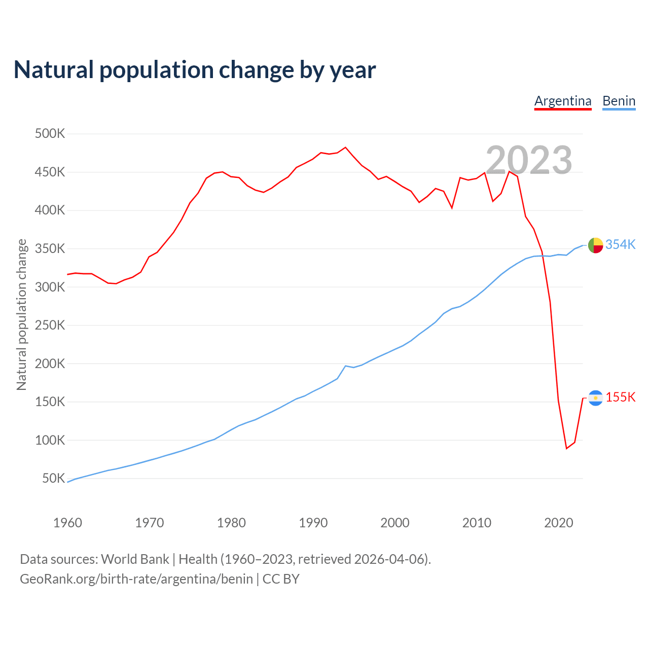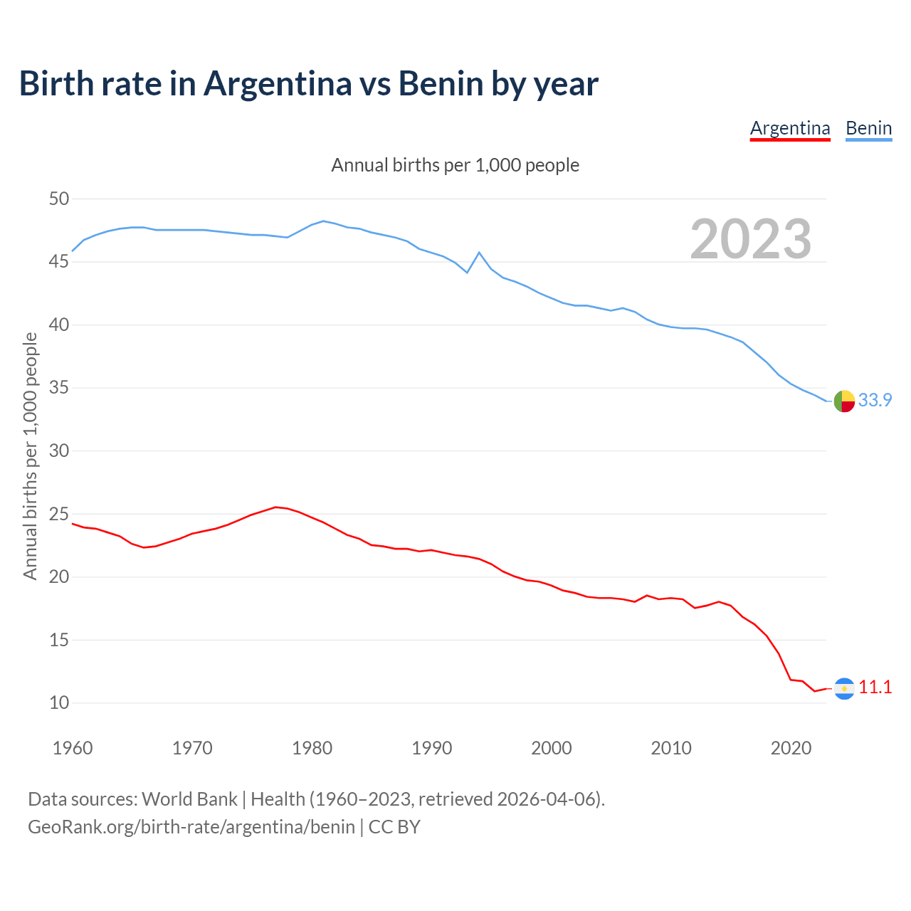 According to the latest available data on birth rates, the fertility rate in Argentina was 1.5 children per woman in 2023, compared to 4.56 in Benin in 2023. The replacement level is considered to be 2.1 children per woman.