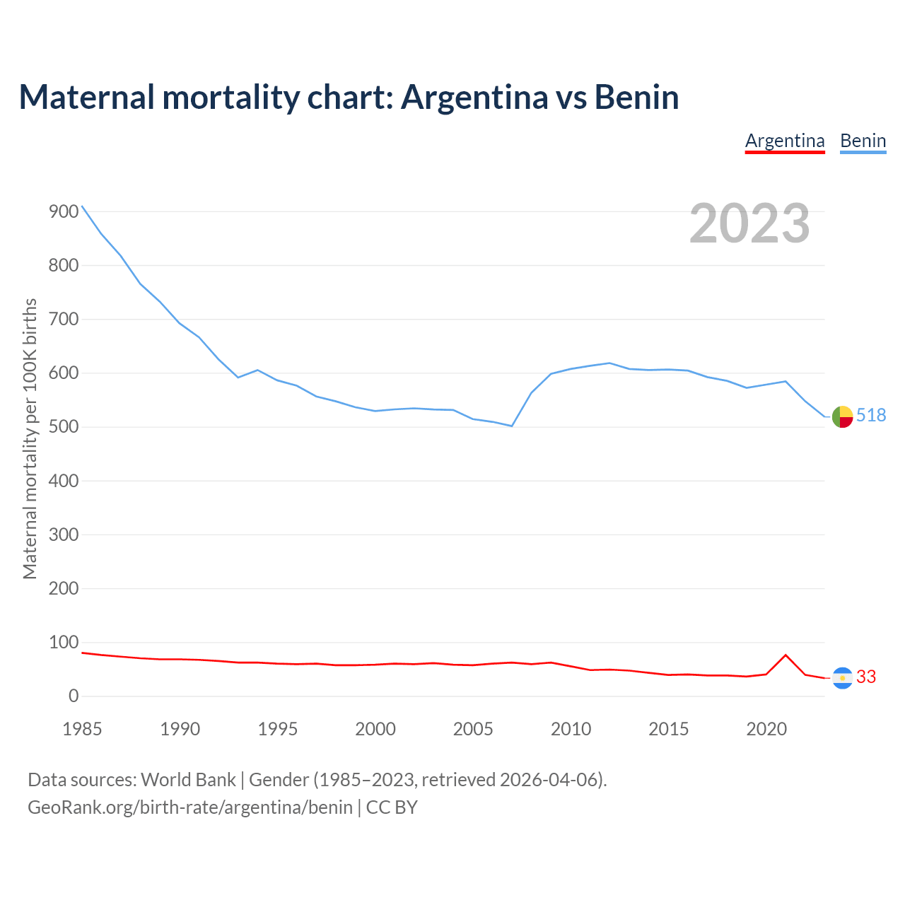 The maternal mortality rate, which is the probability of dying during childbirth or within 42 days of pregnancy termination, is 33 deaths per 100,000 live births in Argentina, compared to 518 deaths in Benin.