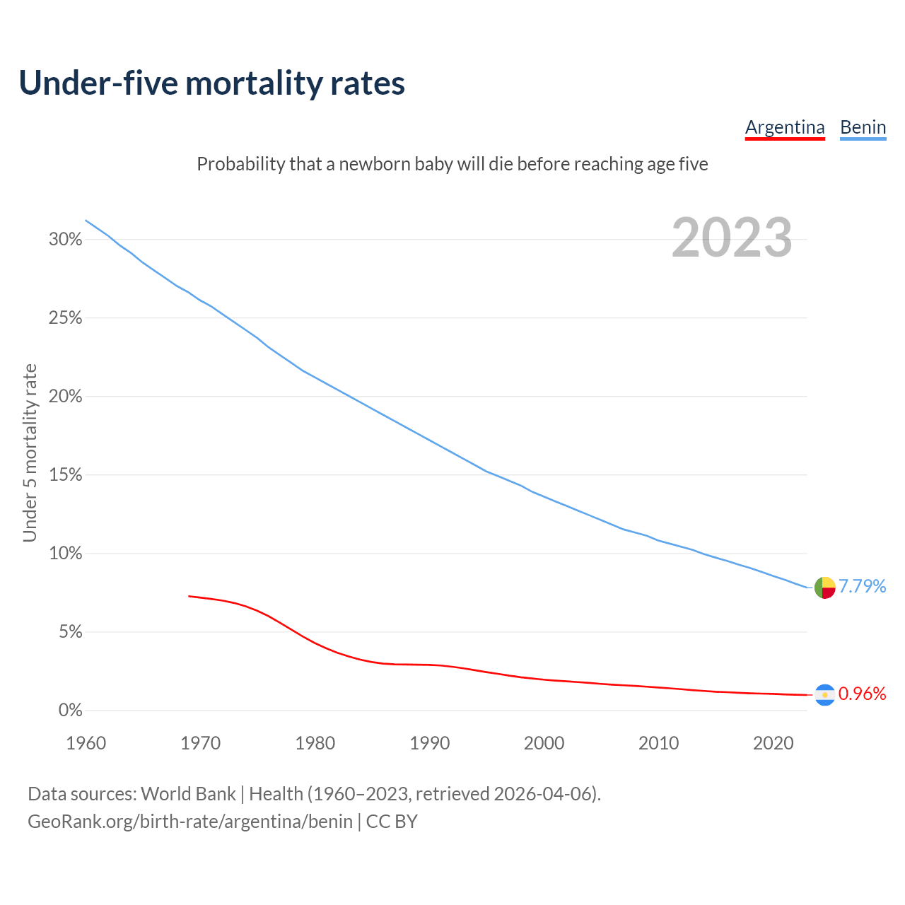The chance that a newborn baby will die before reaching age five is 0.96% in Argentina and 7.79% in Benin. Above is a chart with historical data on under-five mortality rates.