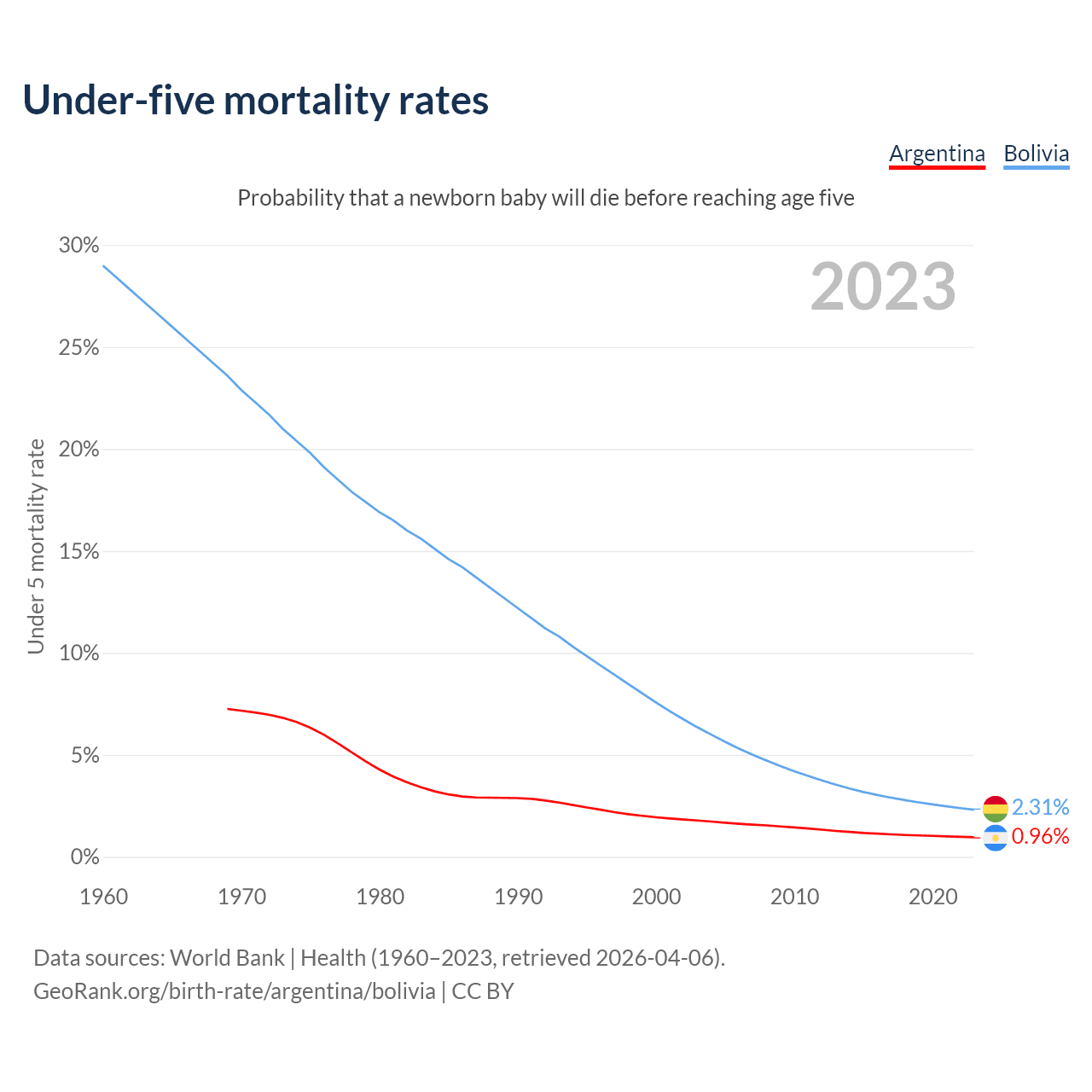The chance that a newborn baby will die before reaching age five is 0.96% in Argentina and 2.31% in Bolivia. Above is a chart with historical data on under-five mortality rates.