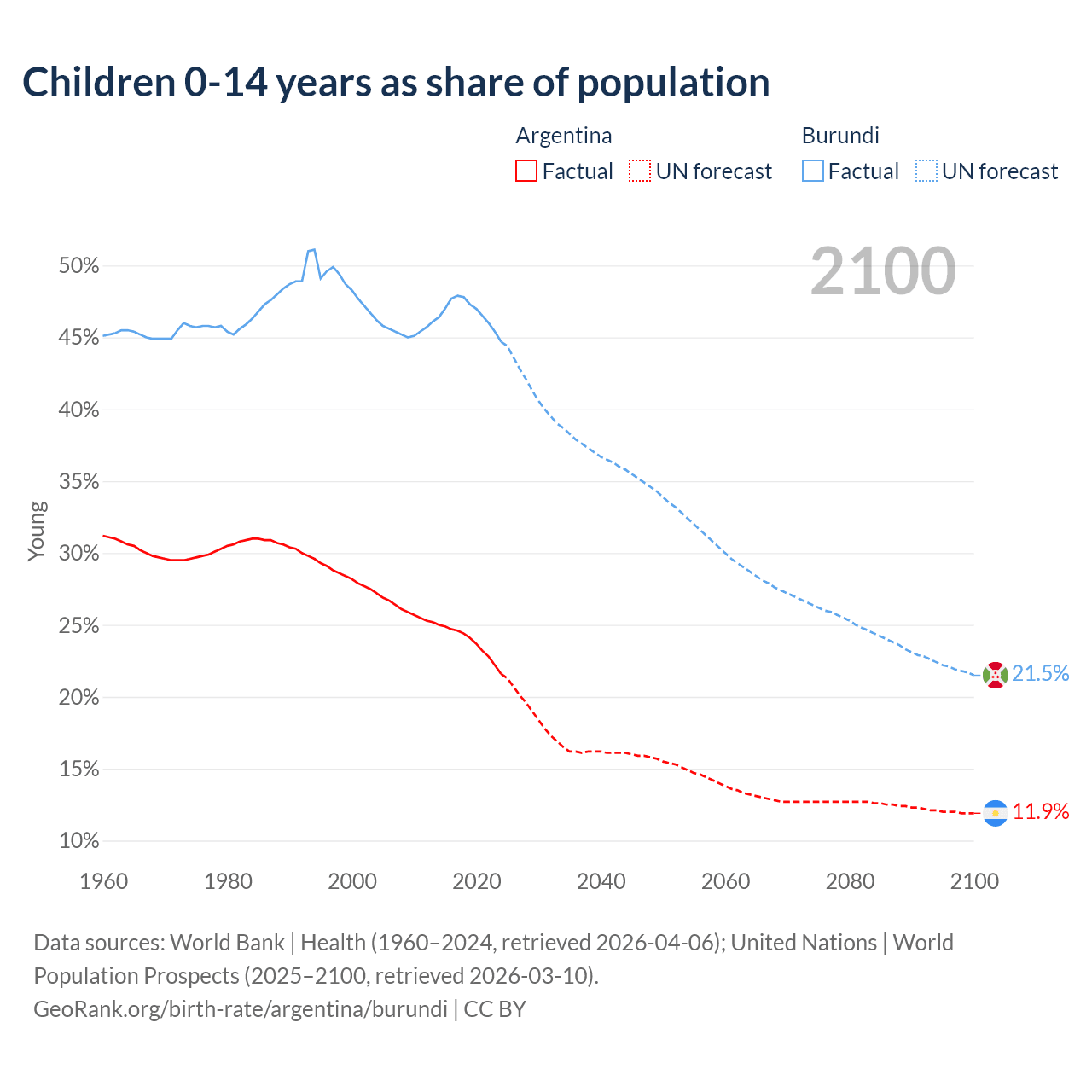 According to the latest available data on birth rates, the fertility rate in Argentina was 1.5 children per woman in 2023, compared to 4.88 in Burundi in 2023. The replacement level is considered to be 2.1 children per woman.