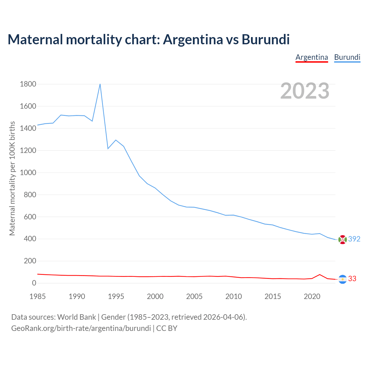 The maternal mortality rate, which is the probability of dying during childbirth or within 42 days of pregnancy termination, is 33 deaths per 100,000 live births in Argentina, compared to 392 deaths in Burundi.