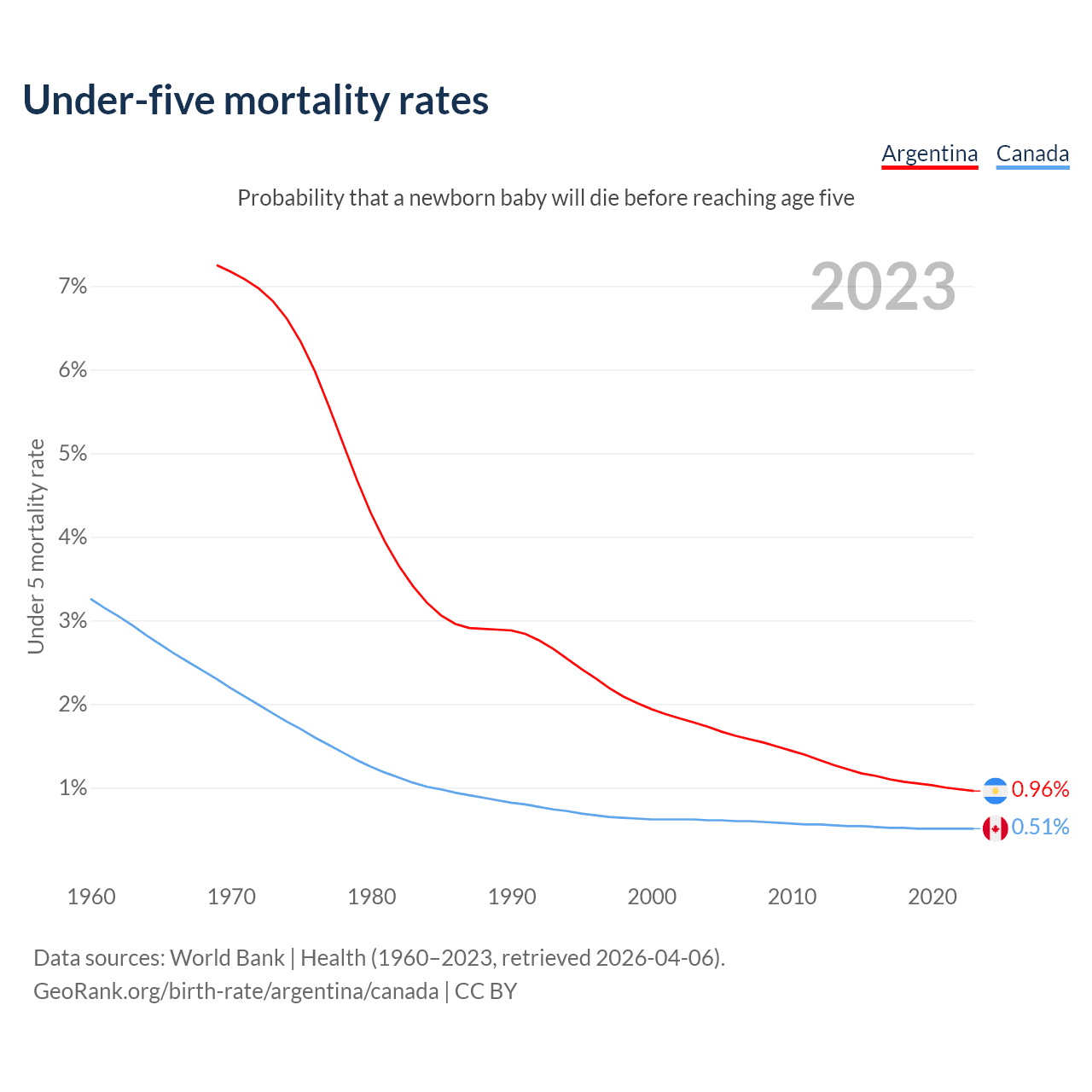 The chance that a newborn baby will die before reaching age five is 0.96% in Argentina and 0.51% in Canada. Above is a chart with historical data on under-five mortality rates.