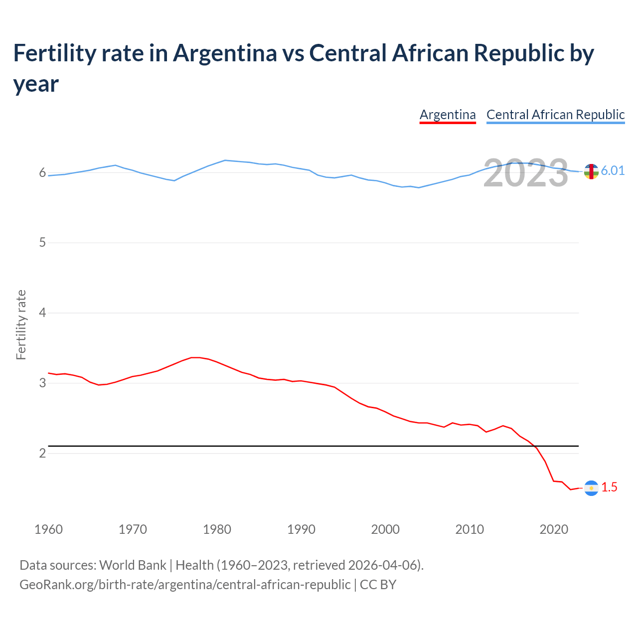 1960 vs 2023, the fertility rate has changed by 52.2% in Argentina and by +1.08% in the Central African Republic — in 1960, it was 3.14 and 5.95, respectively.