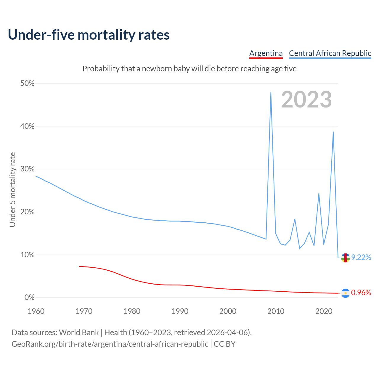 The chance that a newborn baby will die before reaching age five is 0.96% in Argentina and 9.22% in the Central African Republic. Above is a chart with historical data on under-five mortality rates.