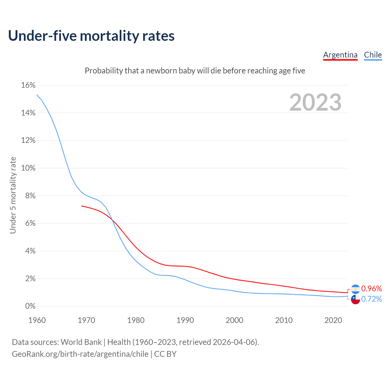 The chance that a newborn baby will die before reaching age five is 0.96% in Argentina and 0.72% in Chile. Above is a chart with historical data on under-five mortality rates.
