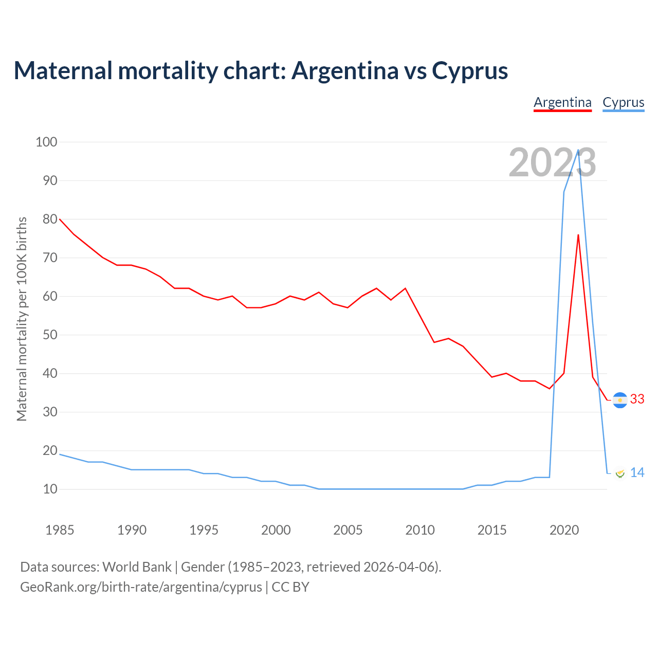 The maternal mortality rate, which is the probability of dying during childbirth or within 42 days of pregnancy termination, is 33 deaths per 100,000 live births in Argentina, compared to 14 deaths in Cyprus.