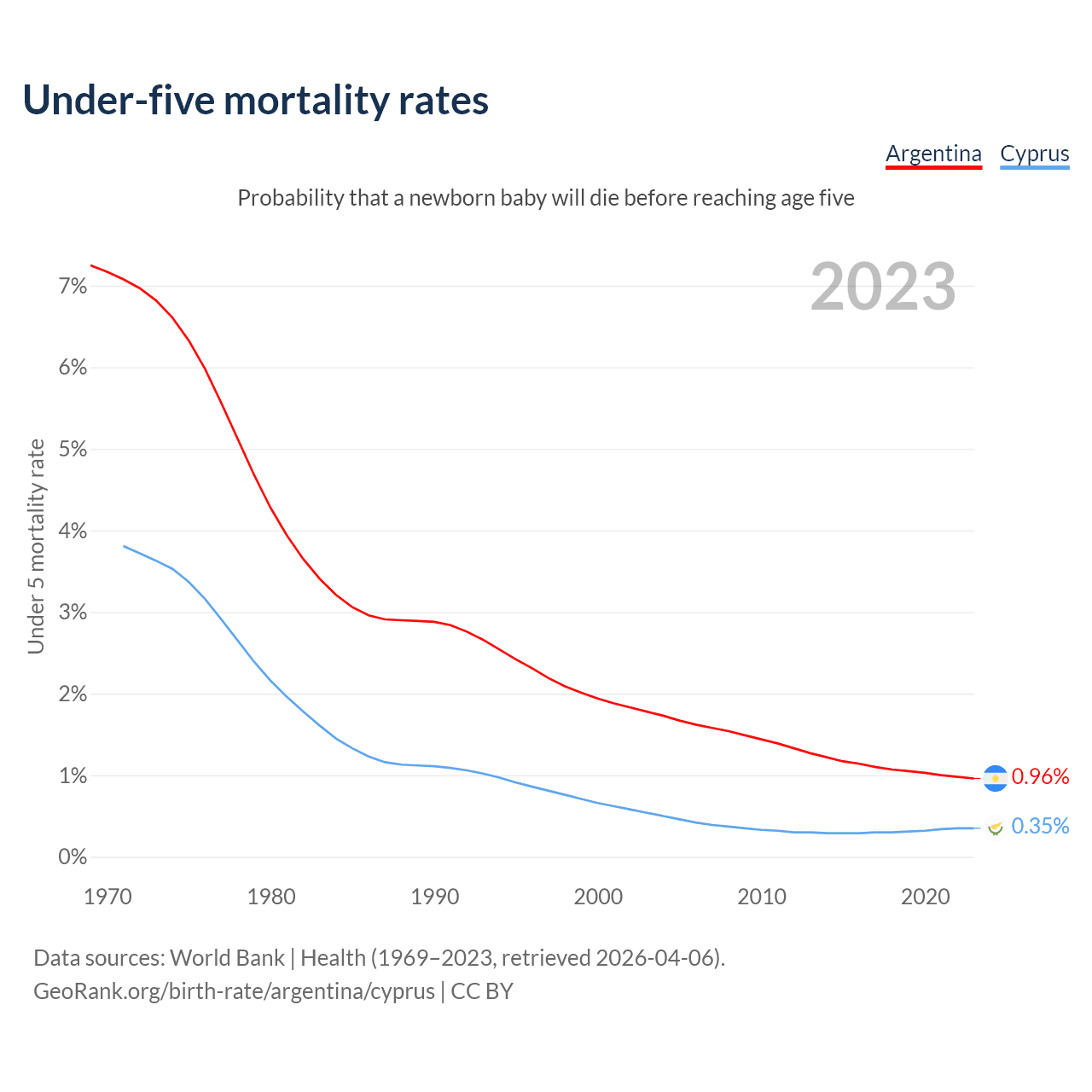 The chance that a newborn baby will die before reaching age five is 0.96% in Argentina and 0.35% in Cyprus. Above is a chart with historical data on under-five mortality rates.