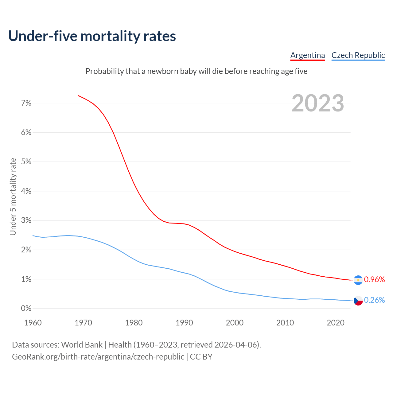 The chance that a newborn baby will die before reaching age five is 0.96% in Argentina and 0.26% in the Czech Republic. Above is a chart with historical data on under-five mortality rates.
