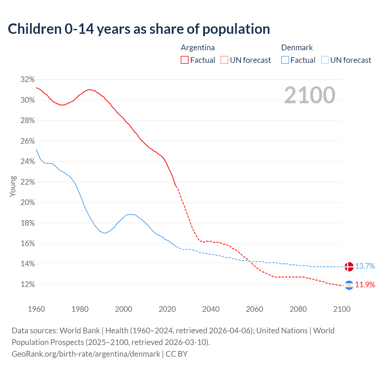 According to the latest available data on birth rates, the fertility rate in Argentina was 1.5 children per woman in 2023, compared to 1.5 in Denmark in 2023. The replacement level is considered to be 2.1 children per woman.