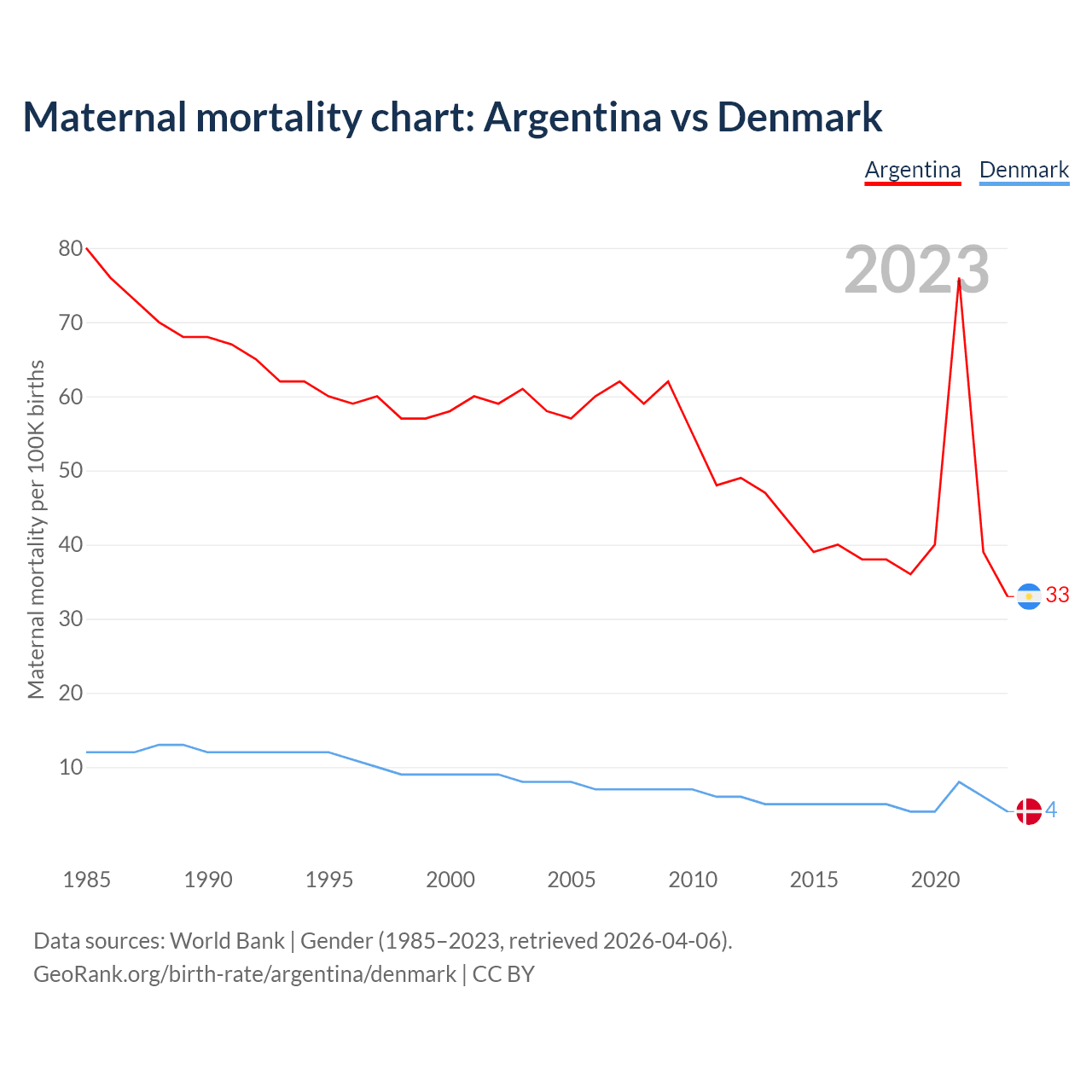 The maternal mortality rate, which is the probability of dying during childbirth or within 42 days of pregnancy termination, is 33 deaths per 100,000 live births in Argentina, compared to 4 deaths in Denmark.