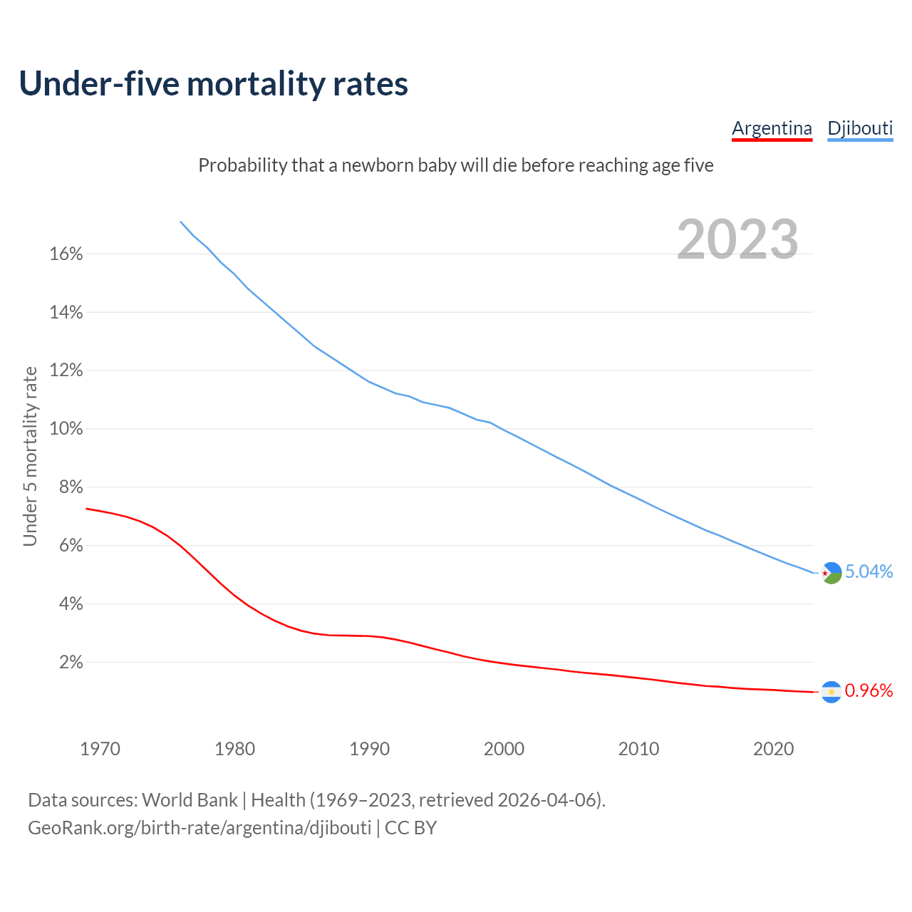 The chance that a newborn baby will die before reaching age five is 0.96% in Argentina and 5.04% in Djibouti. Above is a chart with historical data on under-five mortality rates.