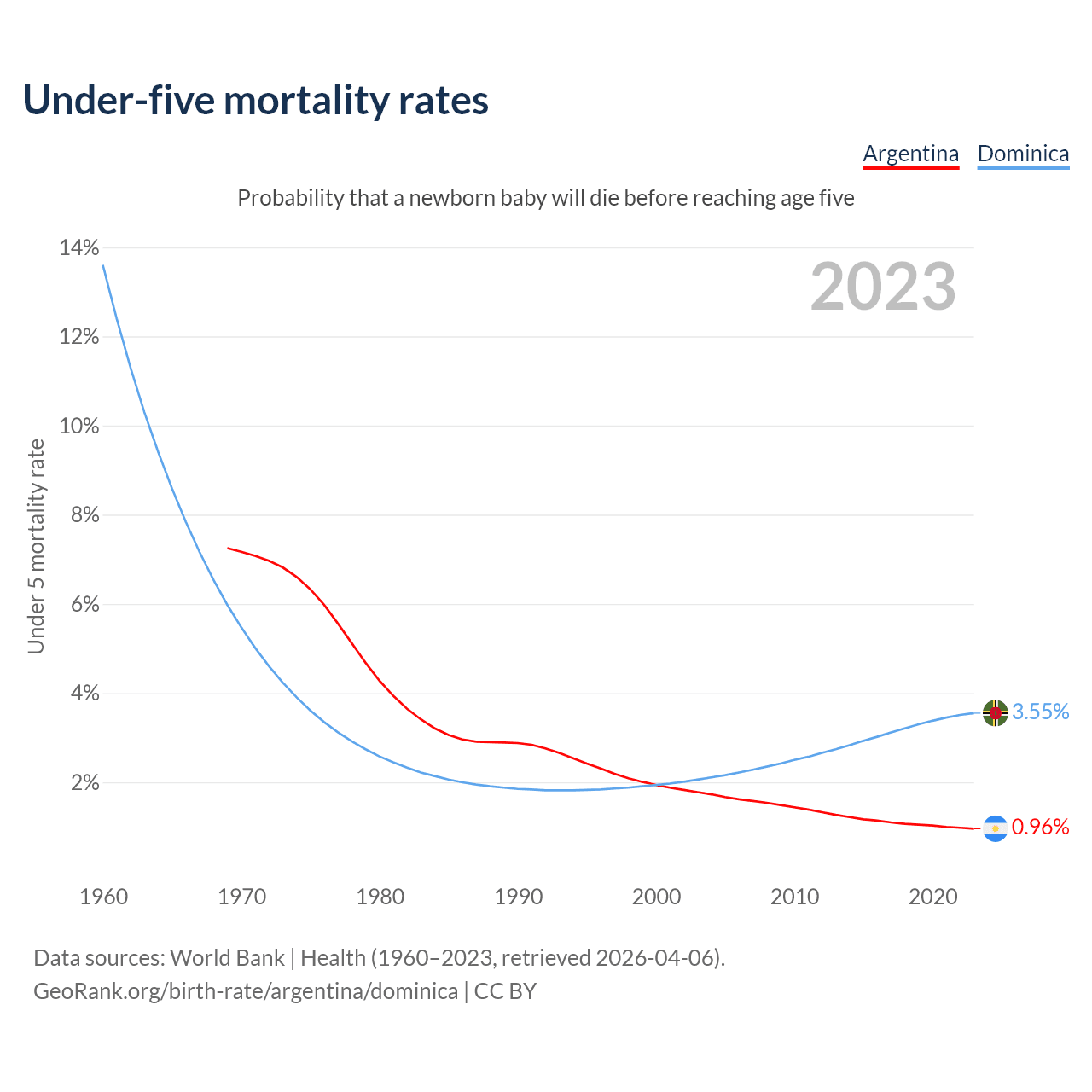 The chance that a newborn baby will die before reaching age five is 0.96% in Argentina and 3.55% in Dominica. Above is a chart with historical data on under-five mortality rates.